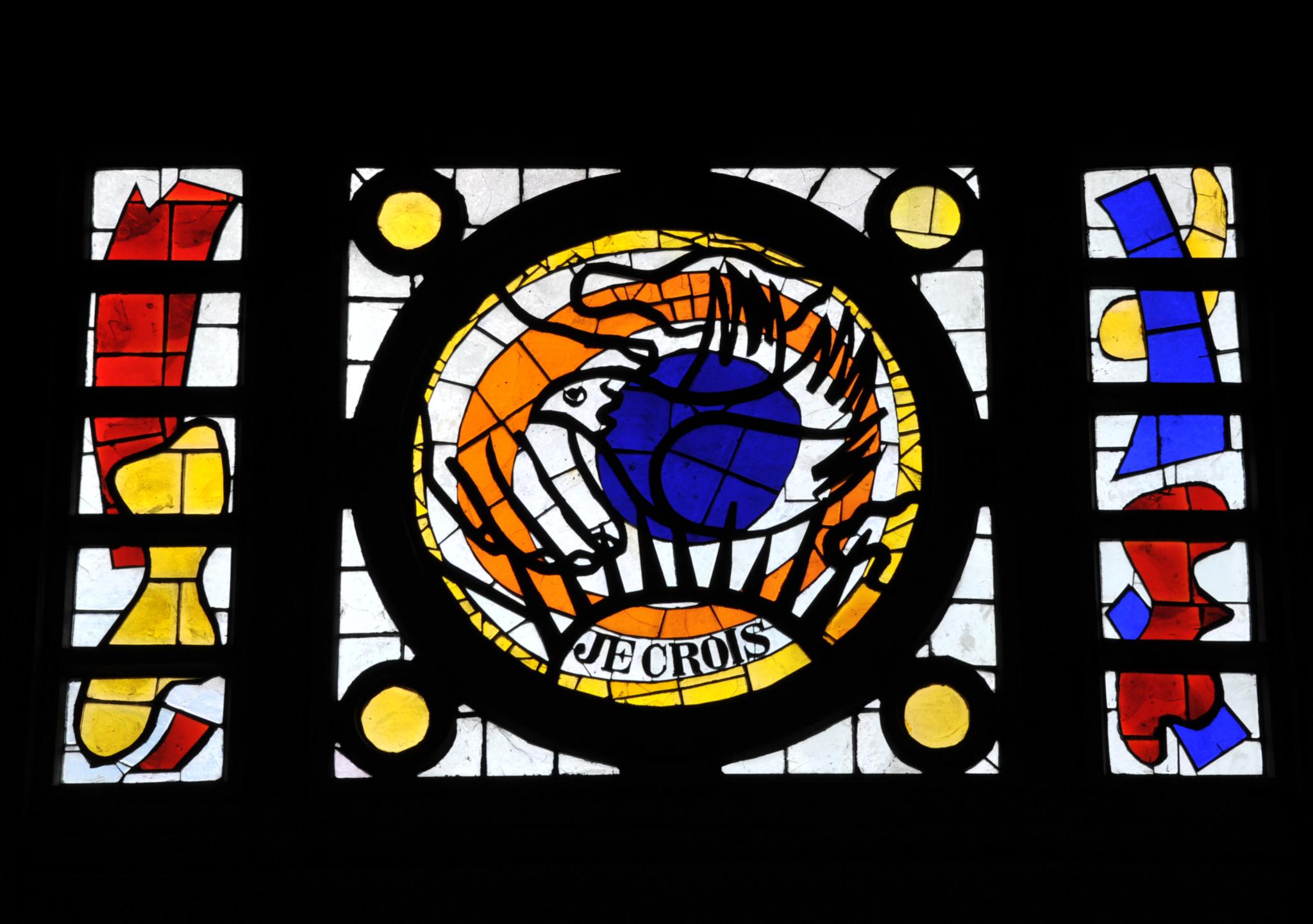 La thématique des vitraux figuratifs de l’Église Saint-Germain d’Auxerre illustre les valeurs fondamentales de l’église catholique, retranscrites dans la prière du Credo. Les thèmes se poursuivent, dans le sens horaire, dans les dix médaillons en dalle de verre dans les fenêtres de la nef principale. Le cycle commence au sud-est de l’église et suit les façades sud et nord pour se terminer au nord-est. Le premier médaillon (SIII) est consacré au premier thème, Dieu le Père. Il illustre les trois premières strophes du Credo : « Je crois en Dieu / Le Père tout Puissant / Créateur du ciel et de la terre ». Dieu est ici symbolisé par la main créatrice, la colombe ainsi que les rayons de soleil. À l’arrière-plan, des taches de couleurs concentriques évoquent la Création, la terre et le cosmos, sur lesquels se lève le soleil.
