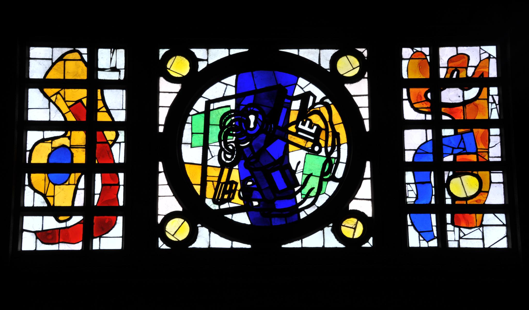 La thématique des vitraux figuratifs de l’Église Saint-Germain d’Auxerre illustre les valeurs fondamentales de l’église catholique, retranscrites dans la prière du Credo. Les thèmes se poursuivent, dans le sens horaire, dans les dix médaillons en dalle de verre dans les fenêtres de la nef principale. Le cycle commence au sud-est de l’église et suit les façades sud et nord pour se terminer au nord-est. Le huitième médaillon (NV) représente la Sainte Église catholique et le Pardon des Péchés. Dans ce médaillon, l’église est évoquée à travers de la Bible et des clefs de saint Pierre, chargé par le Christ de construire l’église. Les clefs – présentées au premier plan, sur fond bleu – sont tenues par une main. La Bible, texte fondateur de la foi catholique, est symbolisée en arrière-plan par un livre.