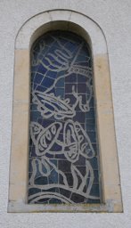 Les fenêtres des bas-côté sont décorées de vitraux en dalle de verre abstraits. Les dalles de verre sont montées avec un mastic spécial dans les ouvertures créant ainsi une entité matérielle entre vitraux et structure en béton et de véritables murs lumineux.