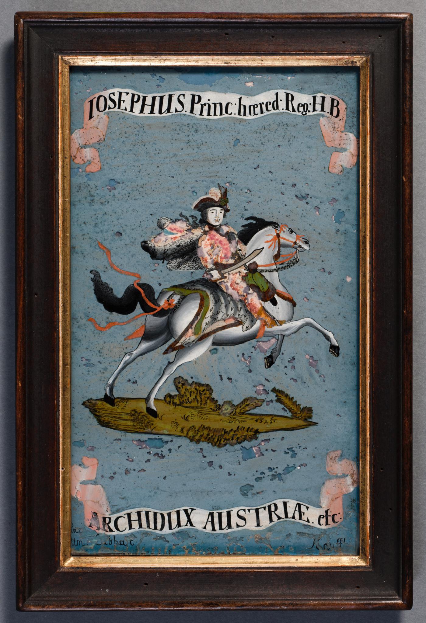 Dieses Werk gehört zur süddeutschen Hinterglasmalereiproduktion, die in der zweiten Hälfte des 18. Jahrhunderts in der bikonfessionellen Reichstadt Kaufbeuren entstanden ist. Es ist das einzige signierte Bild, das uns von Ottmar Labhard (1732–1772) überliefert ist und stellt das Reiterporträt von Joseph I. (1678–1711), Erzherzog von Österreich und, von 1705 bis 1711, Kaiser des Heiligen Römischen Reiches und König von Böhmen, Kroatien und Ungarn dar. Stilistisch aber auch motivisch weist es die charakteristischen Stilmerkmale der Kaufbeurer Hinterglasmalerei auf, die sich von anderen Zentren der Hinterglasmalereiherstellung wie Augsburg, Murnau oder Oberammergau, auch hinsichtlich der Farbgebung und der Maltechnik, grundsätzlich unterscheiden. Der Maler arbeitete mit wenigen schwarzen Konturlinien und einem teilweise lavierenden Farbauftrag. Die Augen bestehen aus mandelförmigen weissen Flecken und schwarzen Punkten als Iris. Der blaue Hintergrund, die rosa abschattierten Enden des Schriftsockels und die blassgraue Hautfarbe sind weitere typische Elemente, die man in Bilddarstellungen anderer Kaufbeurer Hinterglasmaler dieser Zeit auffindet, wie zum Beispiel bei Johann Matthäus Bauhoff (1716–1788) oder Johann Jakob Rumpelt (1706–1788) (Weber et al., 2017, S. 51). Im Bestand des Stadtmuseums Kaufbeurens befinden sich derzeit rund 75 Hinterglasbilder Kaufbeurer Herkunft, die mit weiteren 61 Exemplare aus privaten und öffentlichen Sammlungen in einem Katalog sowie in der Datenbank https://www.bavarikon.de/hinterglasbilder-kaufbeuren erfasst und publiziert worden sind. Aus den Analysen geht hervor, dass diese Werke einer protestantischen Bildsprache entsprechen und aussergewöhnliche Zeugnisse eines protestantischen Selbstverständnisses sind. (Weber et al., 2017, S. 78) Die Abbildung von Joseph I. kann mit Darstellungen anderer Herrscherbildnisse – wie die von König Friedrich II. von Preussen (1712–1786) oder vom schwedischen König Gustav II. Adolf (1594–1632) – in Zusammenhang gebracht werden, die als Bildmotive in Kaufbeuren beliebt waren. Es handelt sich um Persönlichkeiten, welche in den protestantischen Gegenden Süddeutschlands als Beschützer ihres Glaubens verehrt wurden, weil sie sich für den Protestantismus eingesetzt haben. Joseph I. war zwar katholischen Glaubens, er gewährte jedoch in der Altranstädter Konvention, die am 1. September 1707 im Schloss zu Altranstädt zwischen ihm und Karl XII. von Schweden (1682–1718) geschlossen wurde, die Glaubensfreiheit für die schlesischen Protestanten. Den Protestanten wurden die beschlagnahmten Kirchen zurückgegeben und der Bau von sechs weiteren gestattet.