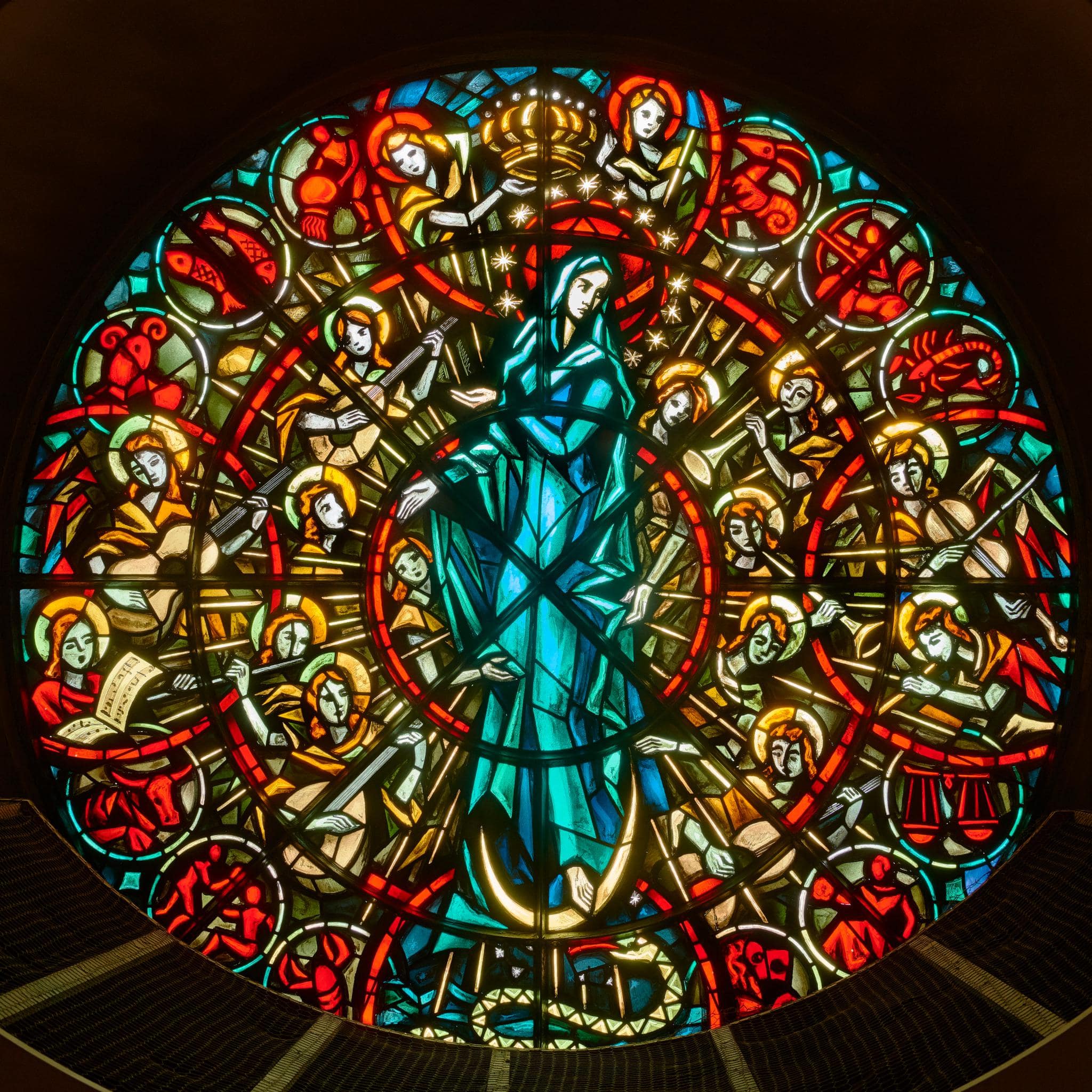 Mais Monnier fait probablement également référence à une autre oeuvre d’art emblématique du patrimoine lausannois : la rose médiévale de la cathédrale. En effet, il inscrit sa Vierge au centre d’un cercle composé d’anges musiciens, mais également, dans le cercle extérieur, des représentations des signes du zodiaque. Cette combinaison rappelle l’iconographie de la rose du monument lausannois, dont le médaillon central comprenait probablement, avant sa restauration à la fin du XIXe siècle par le verrier Edouard Hosch, une personnification de l’année “annus” (Beer 1956, p. 45), au centre de cette image chrétienne du temps et du monde incarnée, entre autres, par les personnifications des saisons, des signes astrologiques et des travaux des mois (Kurmann-Schwarz, 2012, p. 227-245). Ce vitrail de Monnier constitue donc une étape supplémentaire du jeu symbolique qui consiste à mettre en dialogue la cathédrale, première église dédiée à Notre-Dame du chef-lieu vaudois, et la nouvelle église catholique Notre-Dame. Par la construction du haut clocher de 32 mètres, Fernand Dumas mettait déjà en relation visuelle l’édifice du Valentin avec le monument qui le surplombe depuis la Cité. Severini représentait quant à lui la silhouette de la cathédrale en arrière-plan de la partie gauche de sa peinture murale.