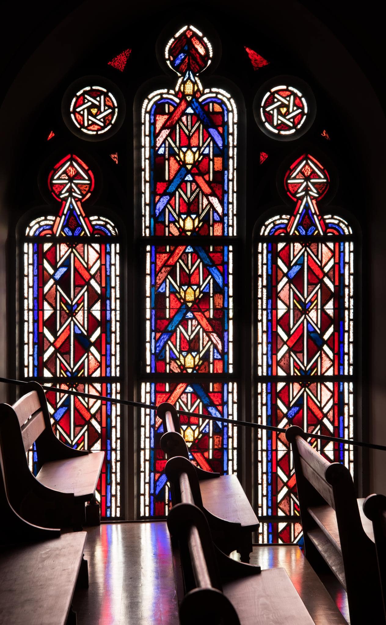 Monumentales, dreilanzettiges Masswerkfenster mit kleinteiligen, geometrischen Ornamenten in Rot- und Blautönen.