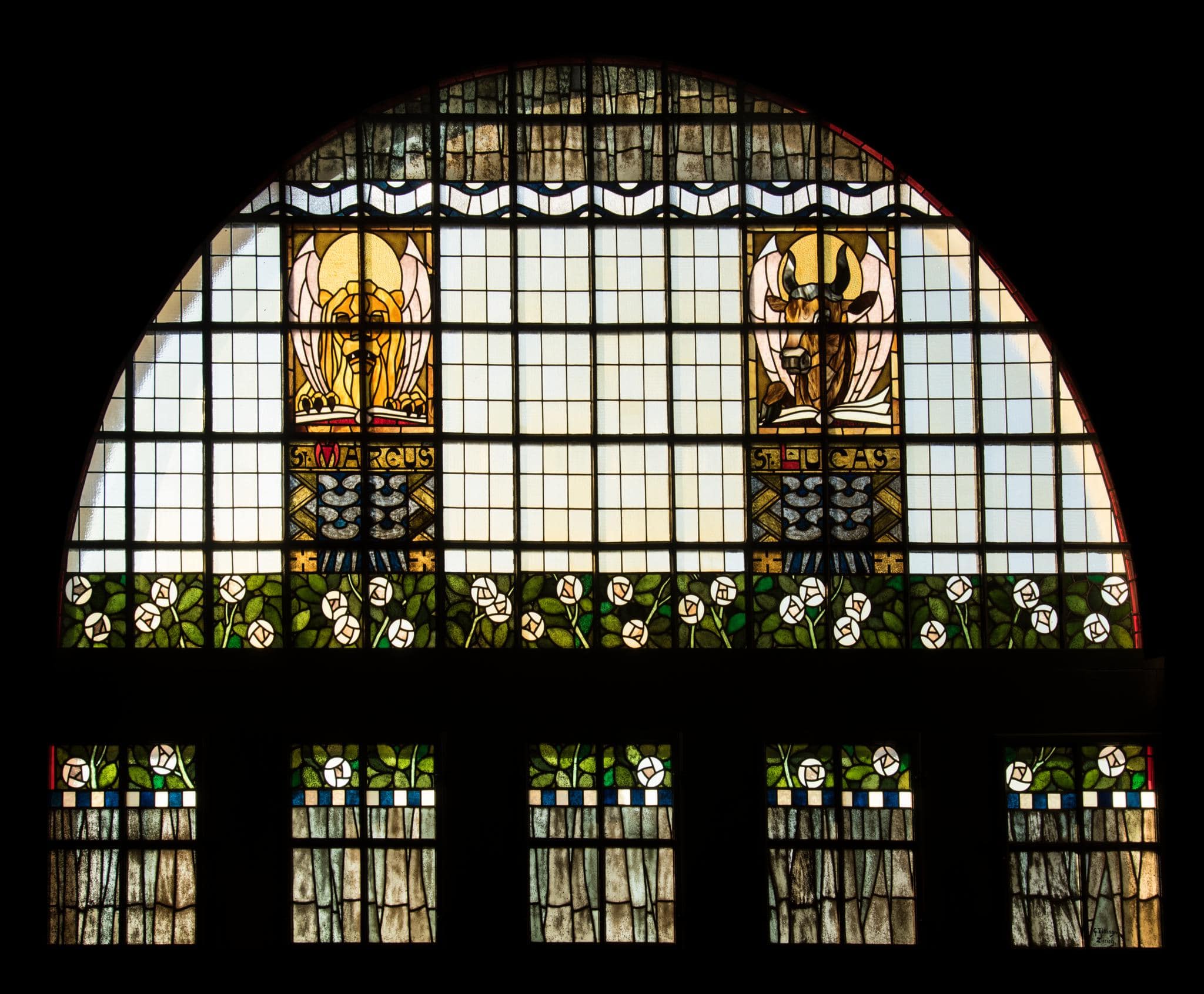 Die Bleiverglasungen der evangelischen Kirche Weinfelden entwarf der Dekorationsmaler Christian Jakob Schmidt aus Zürich, die Umsetzung der Glasmalereien wurde aus Zeitgründen auf die beiden Firmen Huber-Stutz und Röttinger, beide in Zürich, verteilt (Evang. Kirchgemeindearchiv Weinfelden; Brief Pfleghard & Haefeli an die Kirchenbaukommission vom 29.9.1903, sowie Evang. Kirchgemeindearchiv Weinfelden, 310 (02); Rechnungen von Huber-Stutz und Röttinger vom 21. und 31. Dezember 1903). Die Glasmaler Meyner, Winterthur und Berbig, Zürich hatten zwar ebenfalls offeriert, kamen jedoch gemäss den Architekten Pfleghard und Haefeli für die Ausführung von Jugendstilfenstern nicht in Frage (Evang. Kirchgemeindearchiv Weinfelden; Brief Pfleghard & Haefeli an die Kirchenbaukommission vom 29.9.1903). Länger beschäftigt hat die Baukommission offenbar die Frage, welche Motive in den beiden monumentalen Rundbogenfenstern der Emporen dargestellt werden sollten: “Zwar hätten sich dieselben zur Anbringung von Gruppenbildern in grossem Stil wohl geeignet. Allein abgesehen von den hohen Kosten, wäre das einfallende Licht allzusehr von Ihnen gedämpft worden. So beschloss die Kommission, den grösseren Teil der Fläche hell zu halten und nur vereinzelte Figuren anzubringen. […] In erster Linie kamen in Betracht die Symbole der 4 Evangelisten. Dieselben sind zur Ausschmückung eines protestantischen Gotteshauses wohl geeignet und werden in letzter Zeit wieder häufiger angewendet” (Evang. Kirchenbaukommission Weinfelden, 1905). Auf Weisung der Baukommission mussten die Evangelistensymbole in amerikanischem Opaleszentglas ausgeführt werden (Evang. Kirchgemeindearchiv Weinfelden, 310 (02); Rechnung Röttinger vom 31. Dezember 1903).