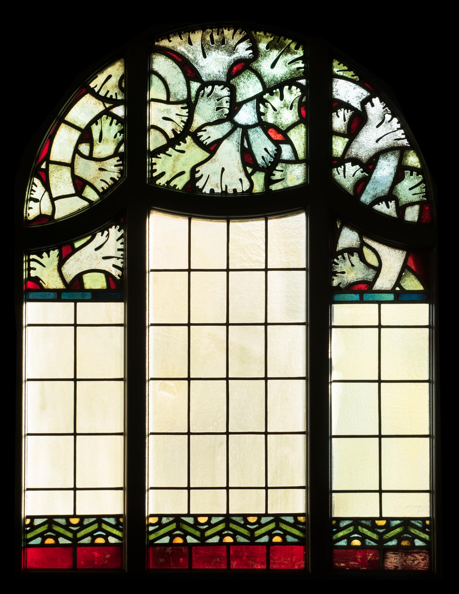 Mehrteiliges Rundbogenfenster mit einem Ornament aus ineinander verwobenen Algen im Bogenfeld. Im Sockelbereich Abschluss mit einem Ornamentband. Ornamentik in den Farben Grün, Blau, Rot und Gelb. Übrige Fensterfläche aus weissem opaken Glas mit rechteckig angeordneten Bleiruten (identisch mit s II und s IV).
