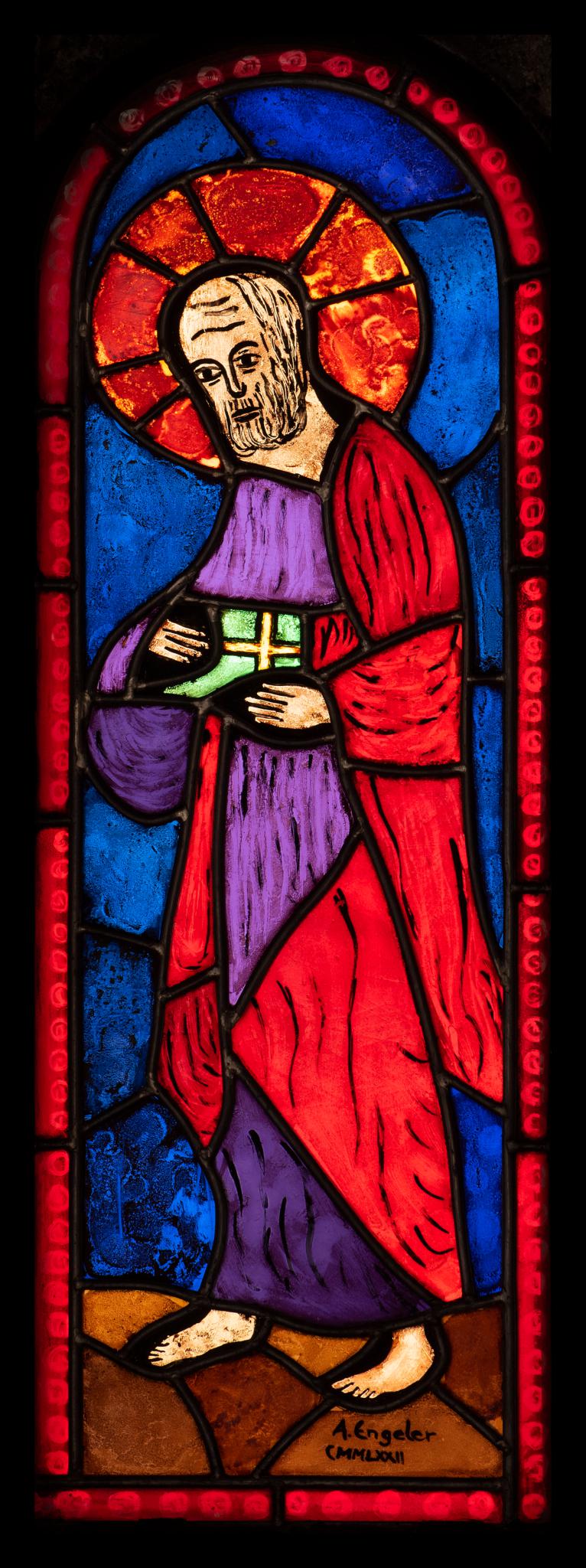 Kleines Fenster in Höhe der Empore mit dem hl. Markus, der das Evangelium in den Händen hält.