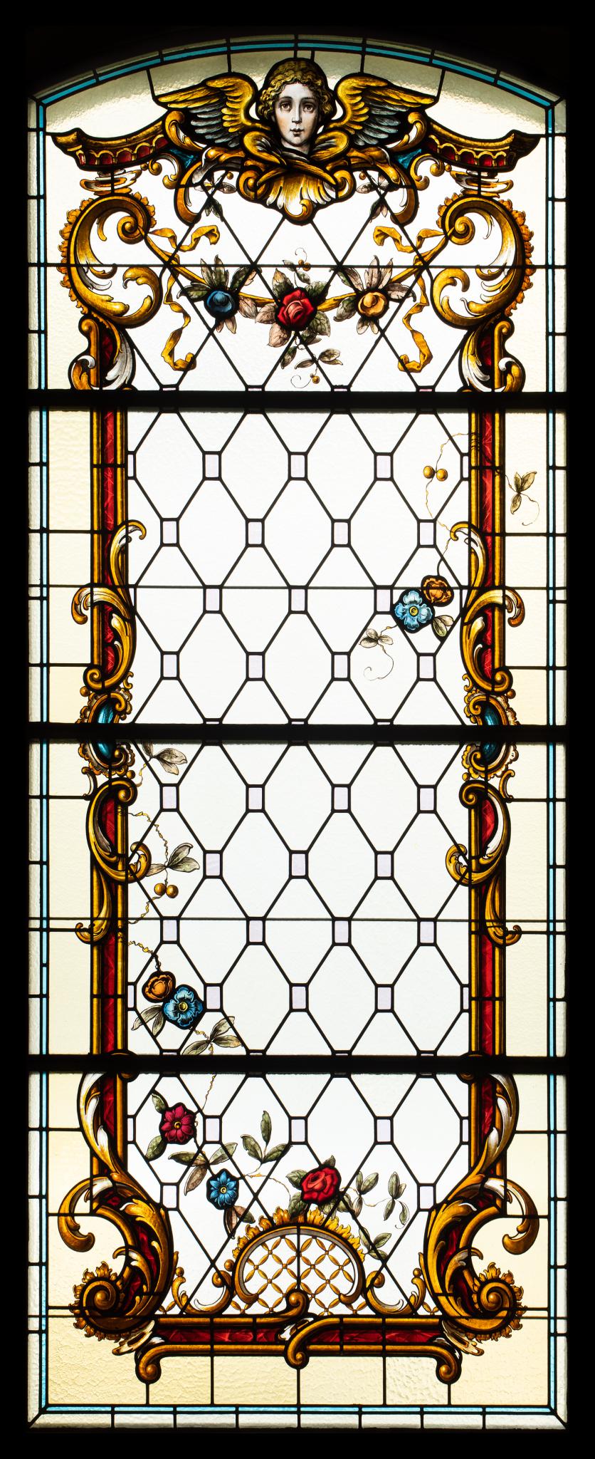 Segmentbogenfenster mit der Darstellung eines üppigen Rahmens aus Rocaillen im Neorokoko-Stil. Der Rahmen ist mit Blumengirlanden und -ranken geschmückt und schliesst oben mit einem Gebälk ab, in dessen Zentrum ein geflügeltes Engelsköpfchen gezeigt ist. Ausserhalb des Rahmens leicht getönte Rechteckverglasung und schmaler farbiger Zierrahmen, innerhalb des Rahmens Rautenverglasung mit lilafarbenen Rechtecken an den Kreuzungspunkten.