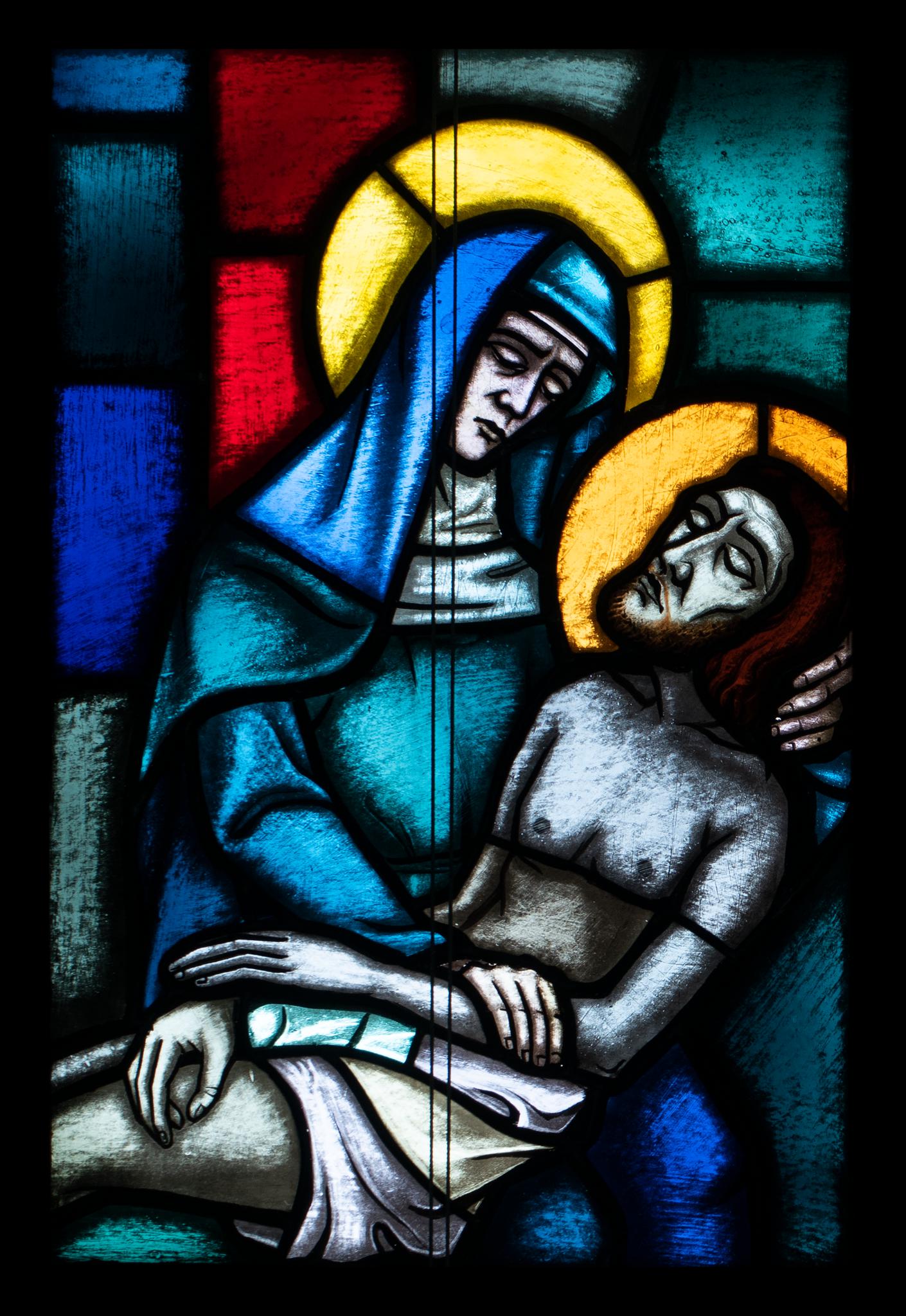 In vierzehn schmalen, in farbige Rechtecke gegliederten Rundbogenfenstern ist ein Kreuzwegzyklus dargestellt. Die Intensität der Farben nimmt nach unten zu. Hier liegt der verstorbene Christus im Schoss seiner Mutter.