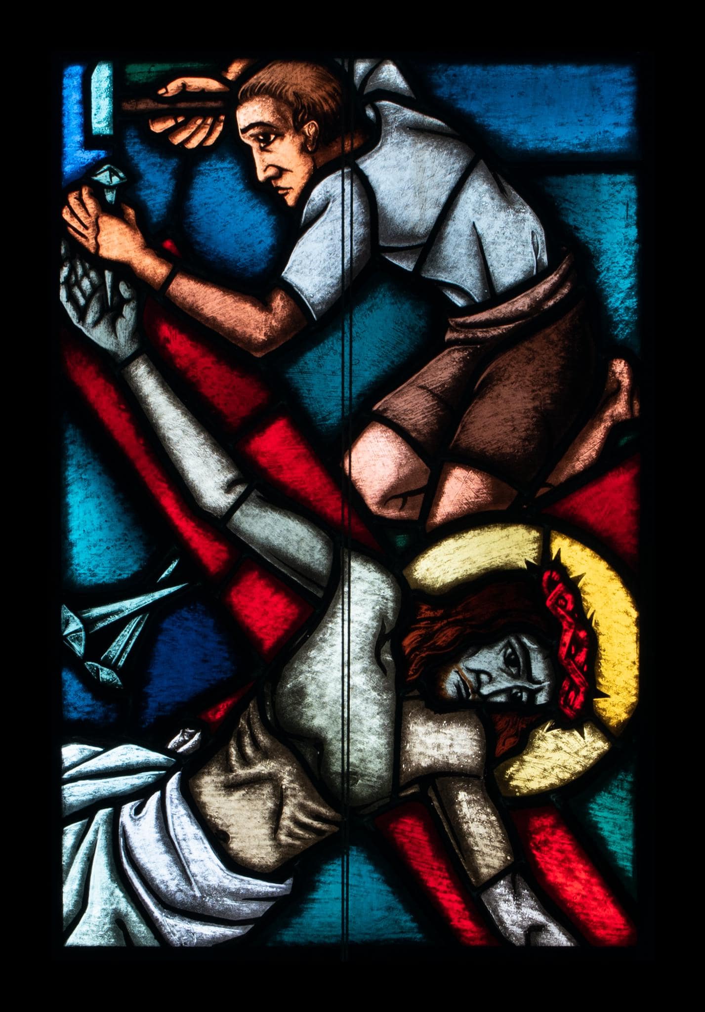 In vierzehn schmalen, in farbige Rechtecke gegliederten Rundbogenfenstern ist ein Kreuzwegzyklus dargestellt. Die Intensität der Farben nimmt nach unten zu. Hier wird Christus an das Kreuz genagelt.