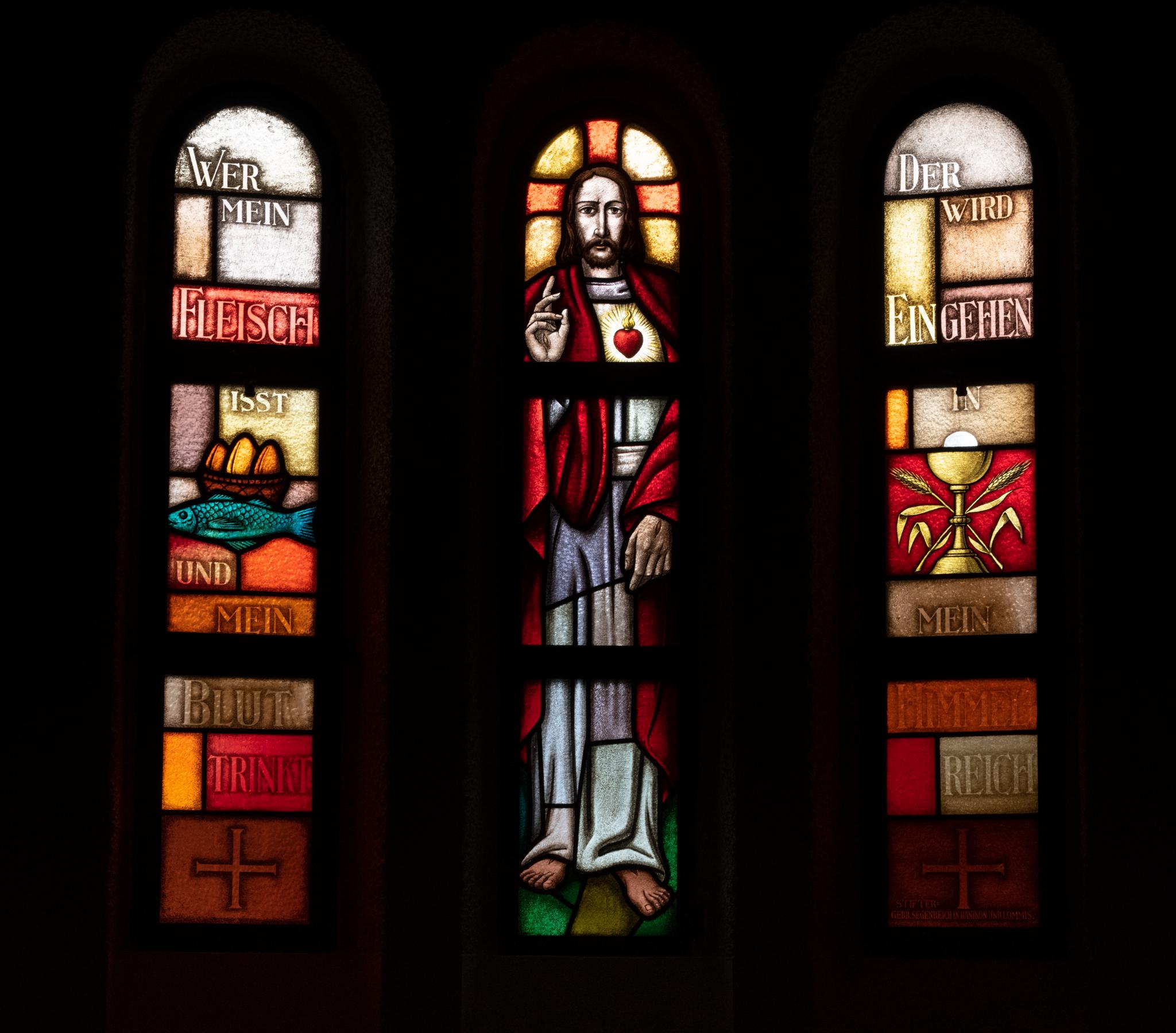 Drei Rundbogenfenster. In der Mitte steht Christus mit Wundmalen und Flammenherz. Zu seinen Seiten sind eucharistische Symbole dargestellt: links Fisch und Brot, rechts Kelch und Ähre.