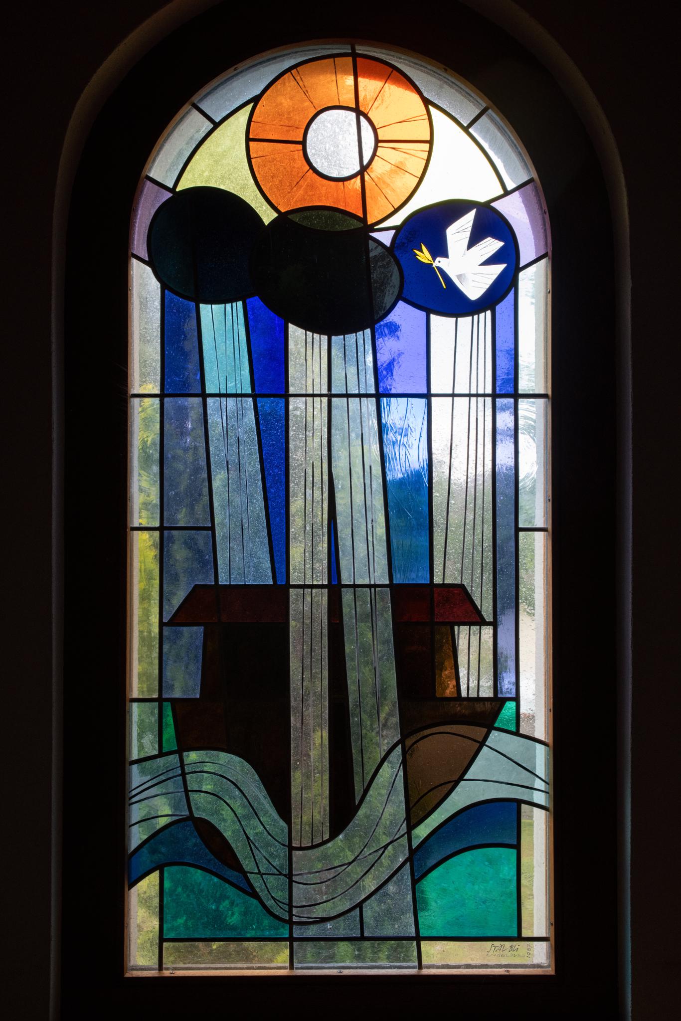 Das Rundbogenfenster zeigt die Arche Noah. Im Bogenfeld steht die Sonne, darunter Wolken, aus denen sich der Regen ergiesst. Von rechts kommt die Taube mit dem Ölzweig geflogen.