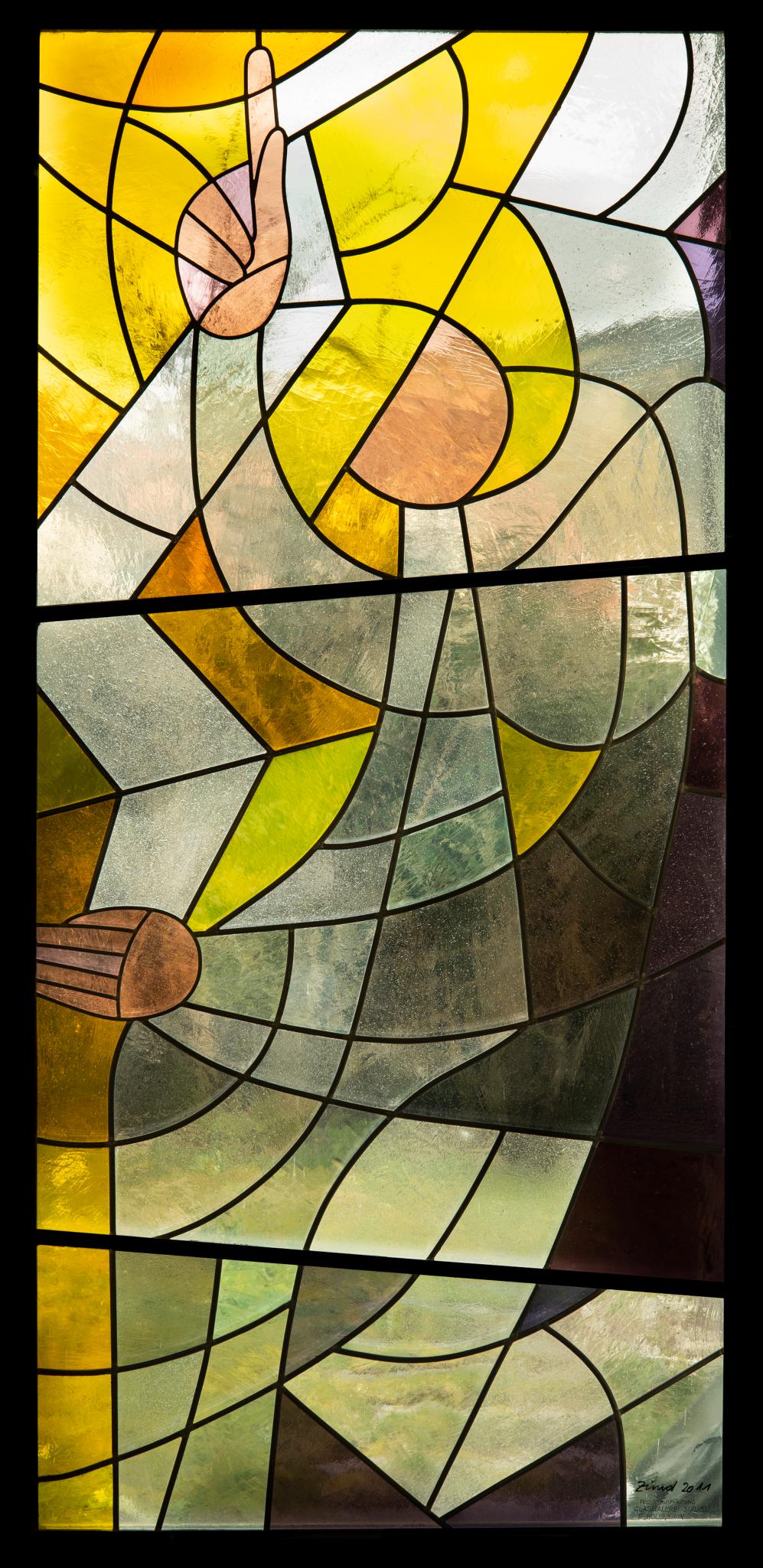 Das rechteckige Fenster in Gelb, Weiss und Violett zeigt einen Engel mit gebeugtem Knie, der mit seiner rechten Hand nach oben gegen Himmel zeigt.