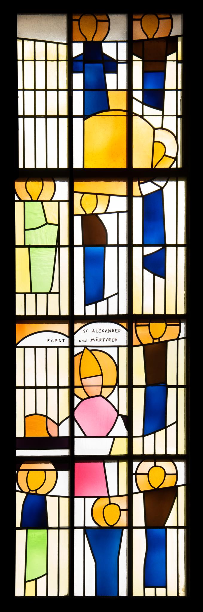 Das hochrechteckige Fenster zeigt den Kirchenpatron Papst Alexander umgeben von Heiligen.