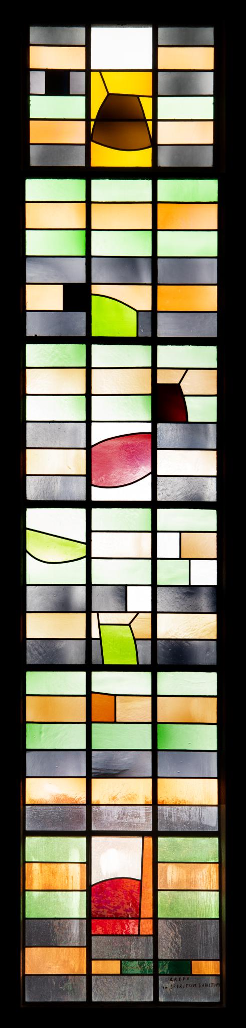 Das hochrechteckige Fenster zeigt farbige Rechtecke und christliche Symbole.