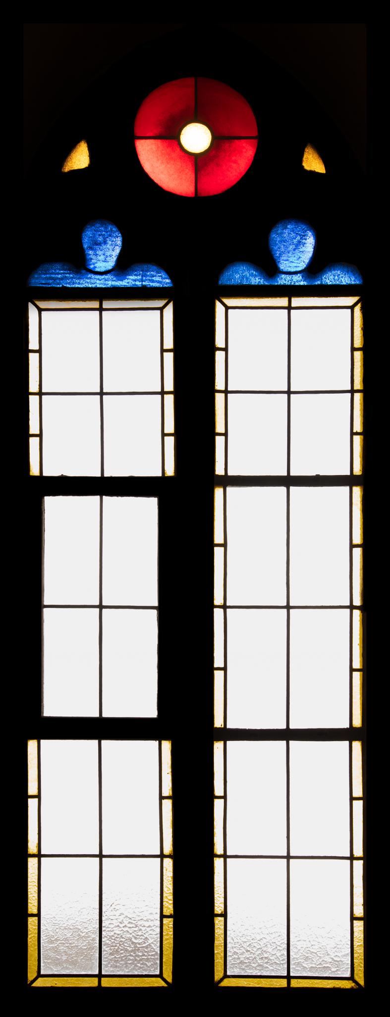Die Schifffenster sIII, sIV, sV, nIII, nII sind blankverglast und weisen einen einfachen Goldbordüre auf, das Masswerk wurde mit grossflächigem Farbglas gestaltet.