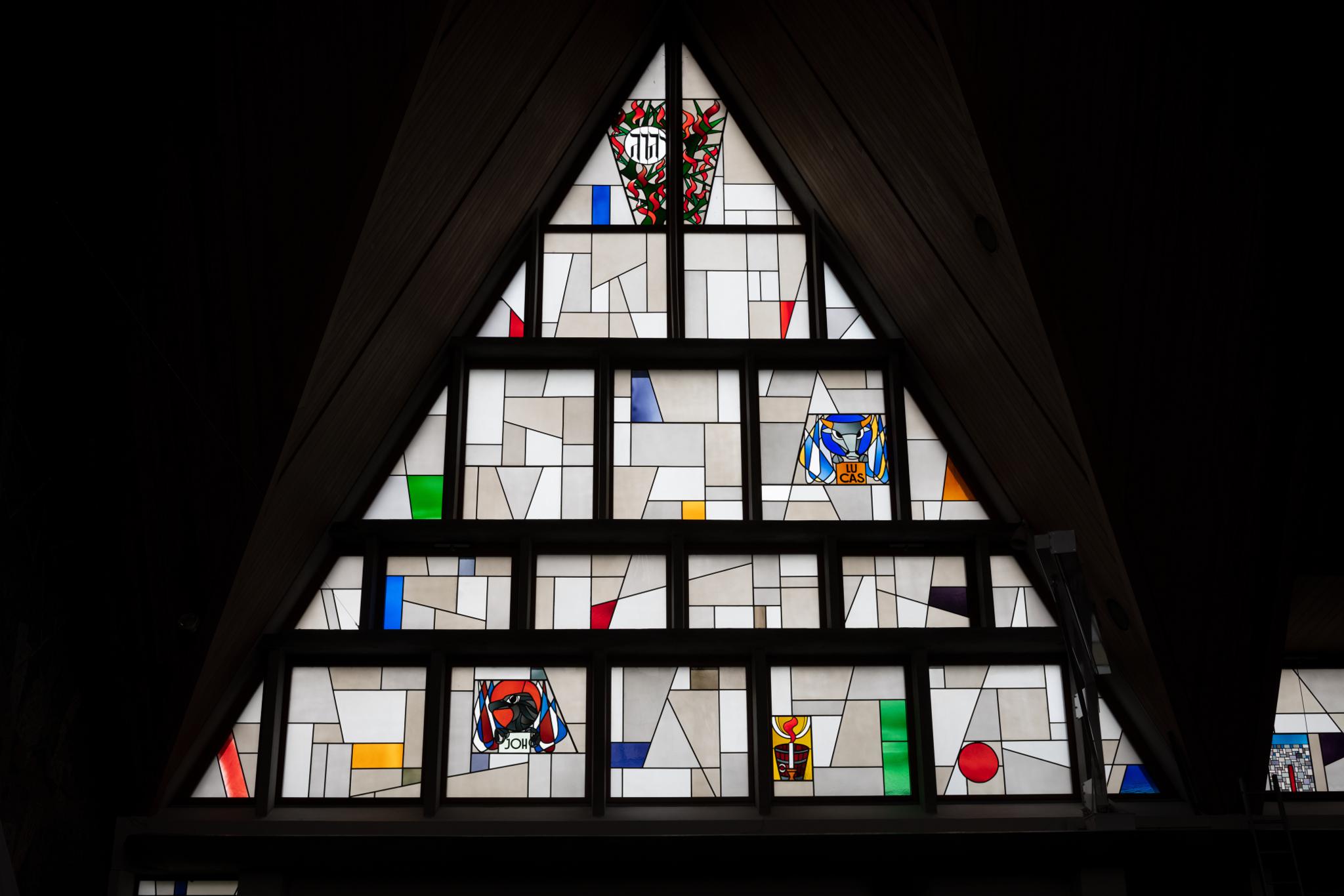 Verglasung des Giebels in grau-weissen geometrischen Formen, durchsetzt mit farbigen Formen sowie einzelnen figürlichen Darstellungen. Zuoberst ist der brennende Dornbusch belegt mit dem Medaillon mit Gottes Name JHWH in hebräischer Schrift dargestellt. Weiter unten erscheinen die Symbole der Evangelisten Lukas und Johannes, Stier und Adler. Rechts unten ist eine brennende Kerze vor einem Scheffel zu sehen. Dies verweist auf das Gleichnis vom Licht unter dem Scheffel (Matthäus 5,16).