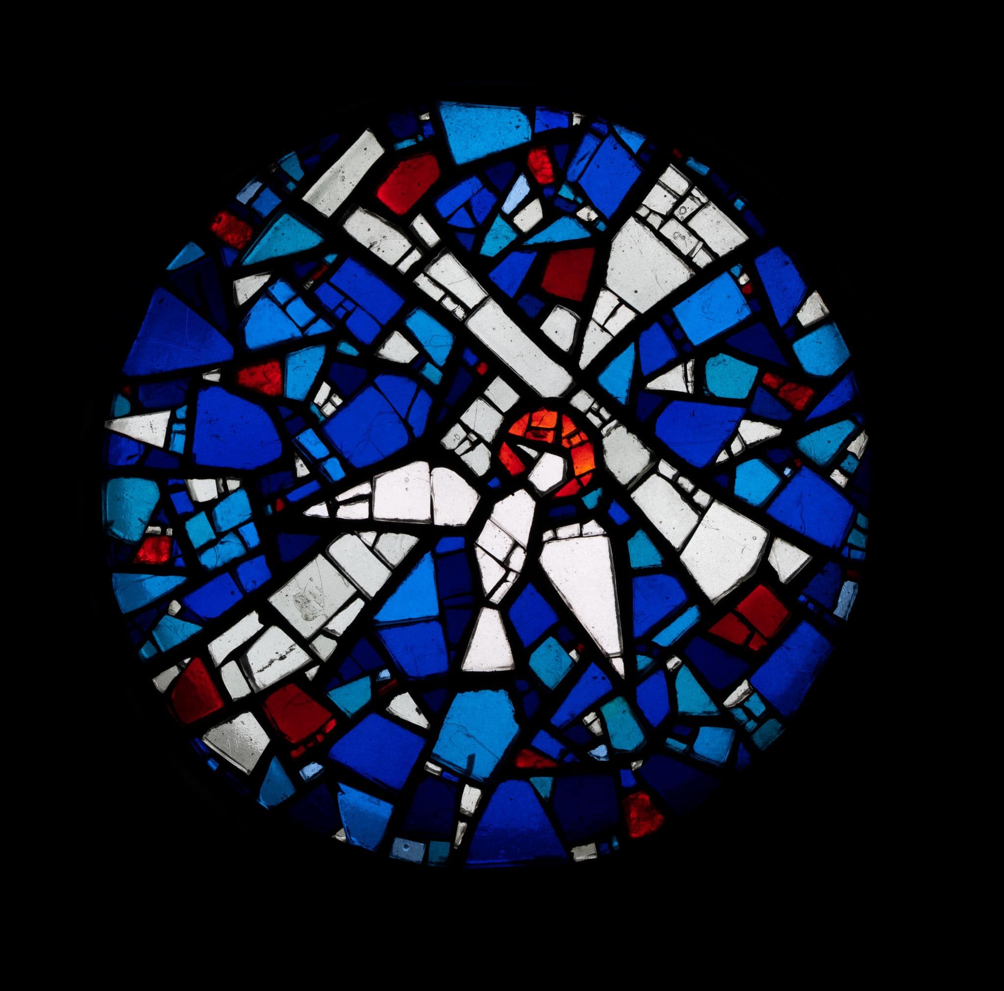 Runde Betonverglasung an der Decke der Taufkapelle. Vor blau-rotem Hintergrund fliegt die Taube des Heiligen Geistes vor einem weissen Kreuz.