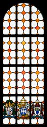 Fenster in grau-weissen geometrischen Formen, durchsetzt mit farbigen Formen sowie dem Vollwappen Franz von Streng.