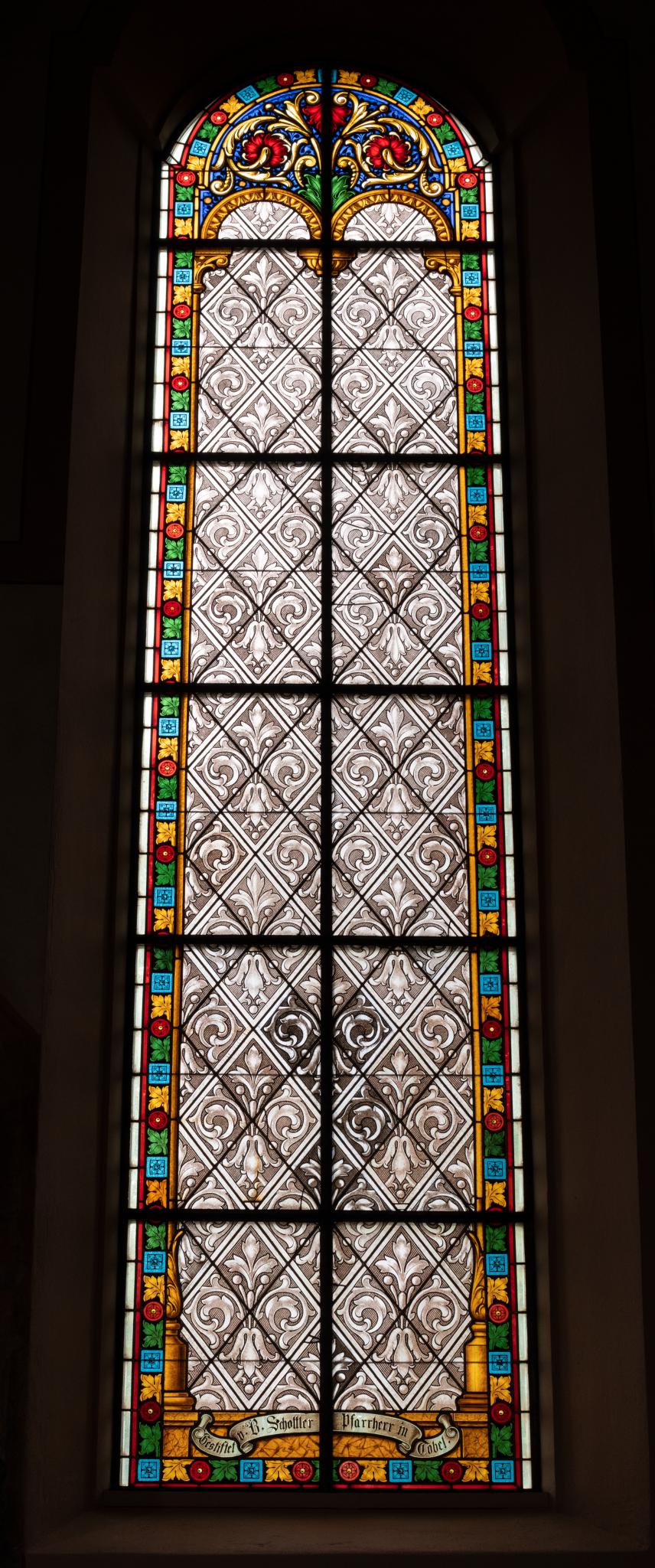 Rundbogenfenster mit Grisaille-Damastmuster, rundbogiger Arkadenrahmung und farbiger floraler Randverzierung. Im Bogenfeld Blattrankenmotiv. Schriftband an der Basis. Identisch mit s II.