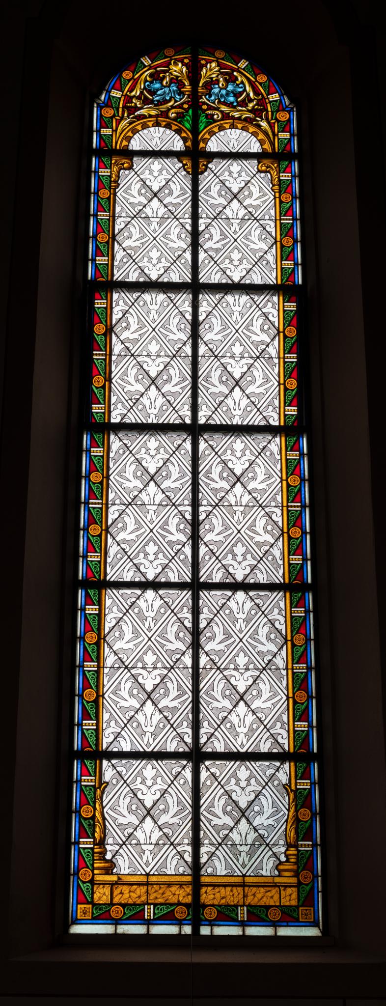 Rundbogenfenster mit Grisaille-Damastmuster, rundbogiger Arkadenrahmung und farbiger Randverzierung. Im Bogenfeld Blattrankenmotiv. Schriftband an der Basis.