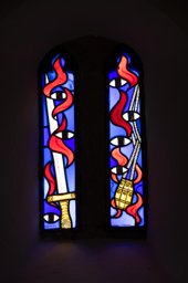 Als die heilige Idda als Inklusin eingeschlossen im Kloster Fischingen lebte, löschte ihr einmal der Teufel ihr Lichtlein aus. Da ging sie ans Fenster und bat einen dort liegenden Leichnam, ihr das Licht wieder anzuzünden. Der Tote stand auf, brachte ihr das Licht und sprach: “Nimm dies' Licht aus meiner Hand / von Toggenburg bin ich genannt!” Es war also ihr reuiger Gemahl Heinrich von Toggenburg, der sie hatte umbringen wollen. Hinter dem Skelett des Grafen ist die Kirche von Bettwiesen zu sehen. Links unten ist das Stifterwappen angebracht.
