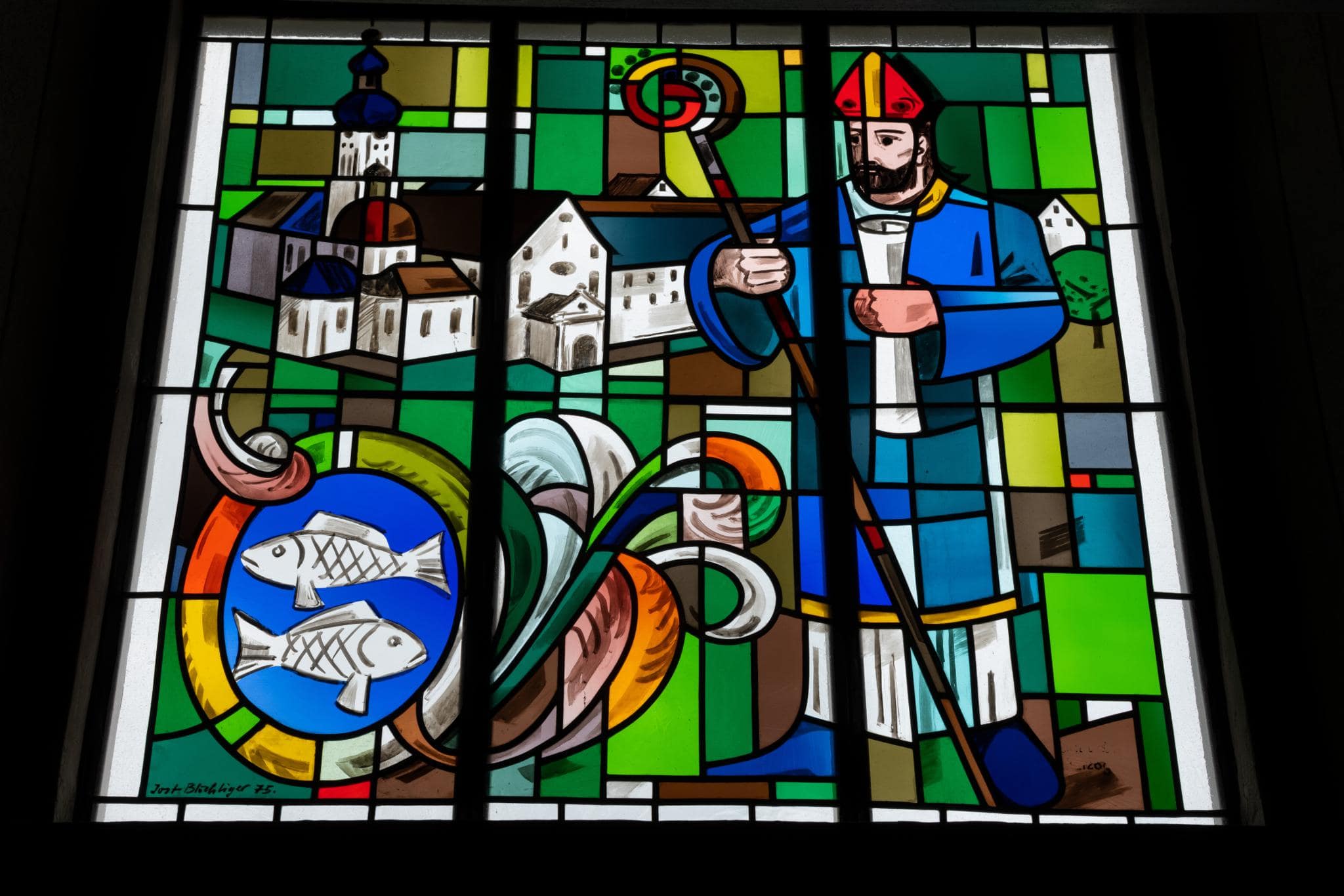 Im Hintergrund ist das Kloster Fischingen dargestellt. Zur rechten Seite steht dessen Abt mit Krummstab und einer Schriftrolle in der Hand, links unten ist das Fischinger Wappen angebracht.