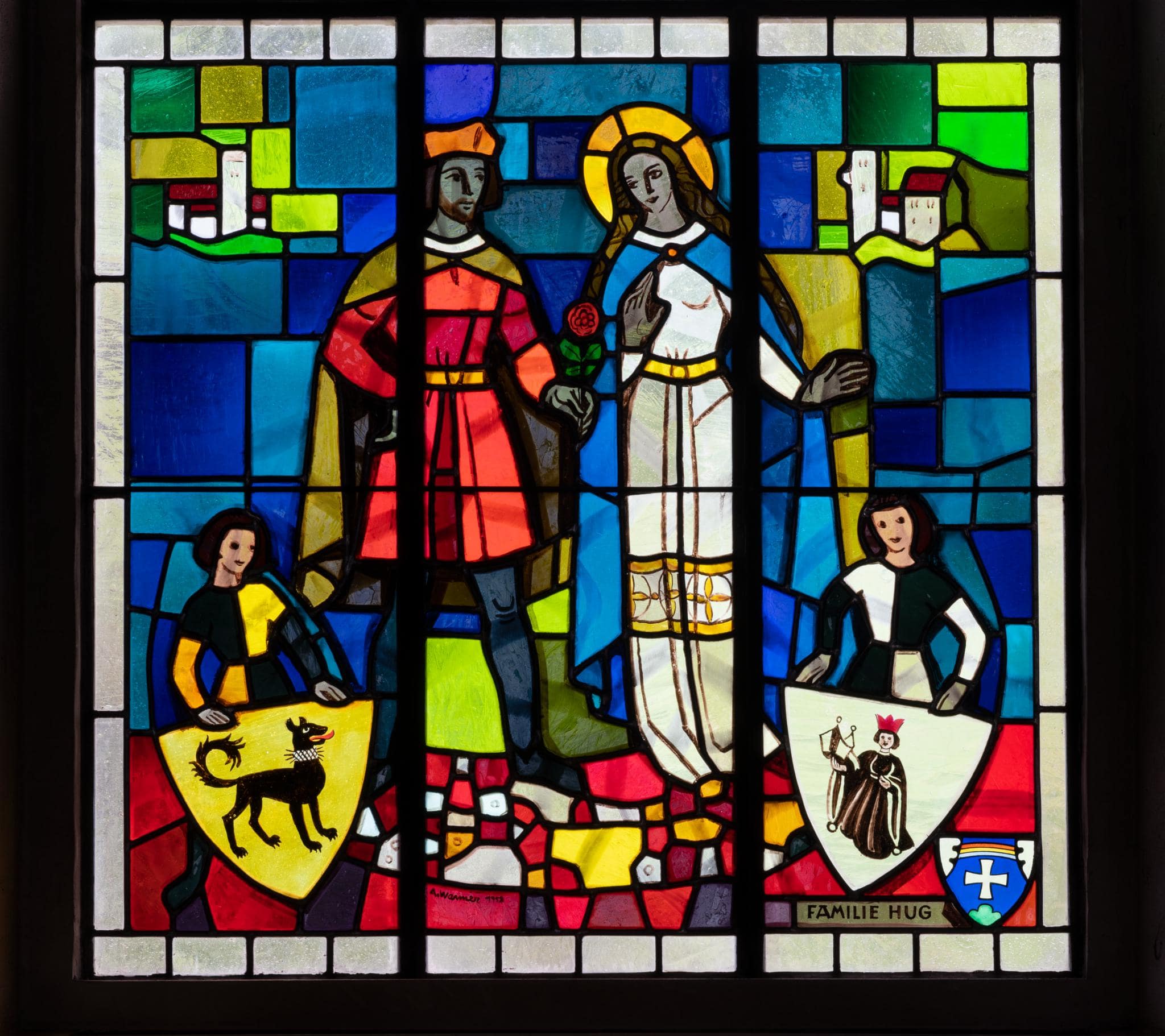 1179 heiratete Idda von Kirchberg (bei Ulm) den Grafen Heinrich von Toggenburg. Neben dem Paar stehen zwei Pagen, welche die Wappenschilde Kirchbergs und Toggenburgs halten. Im Hintergrund sind zwei Kirchen zu sehen. Rechts unten ist das Stifterwappen angebracht.