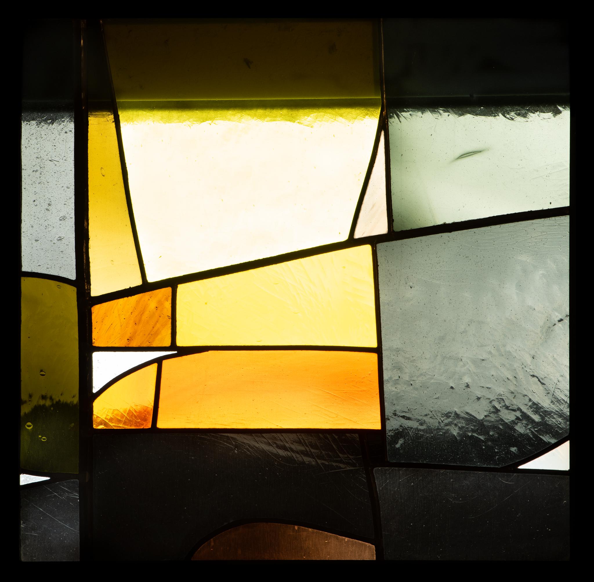 Die einzelnen Sujets befinden sich in einem durchgehenden Fensterband. Ein helles gelb-oranges Viereck wird von dunkleren Vierecken umgeben.