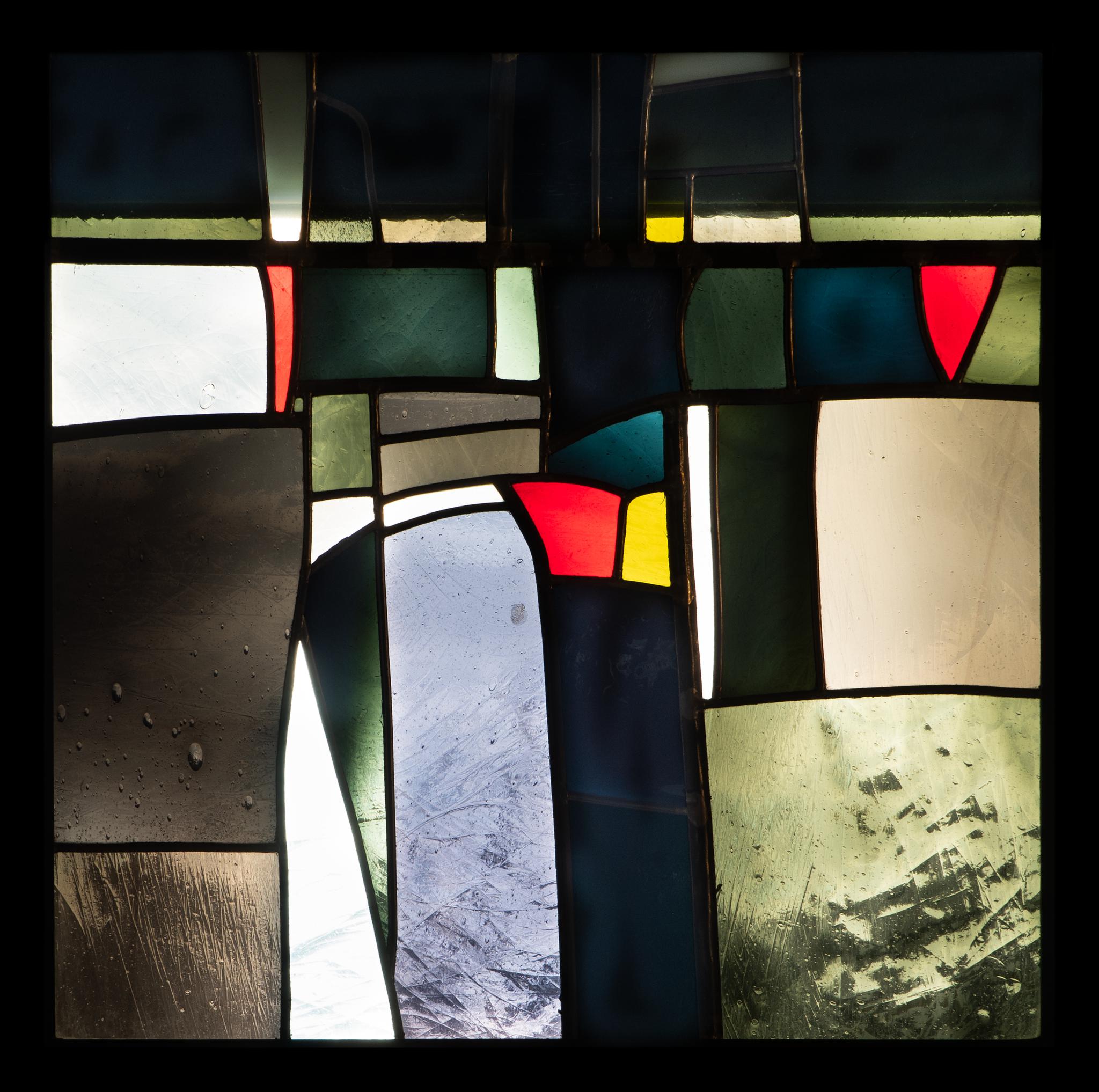 Die einzelnen Sujets befinden sich in einem durchgehenden Fensterband. Es handelt sich hier um das zentrale Fenster. Umgeben von dunklen Vierecken ist ein aufgestelltes Kreuz dargestellt.