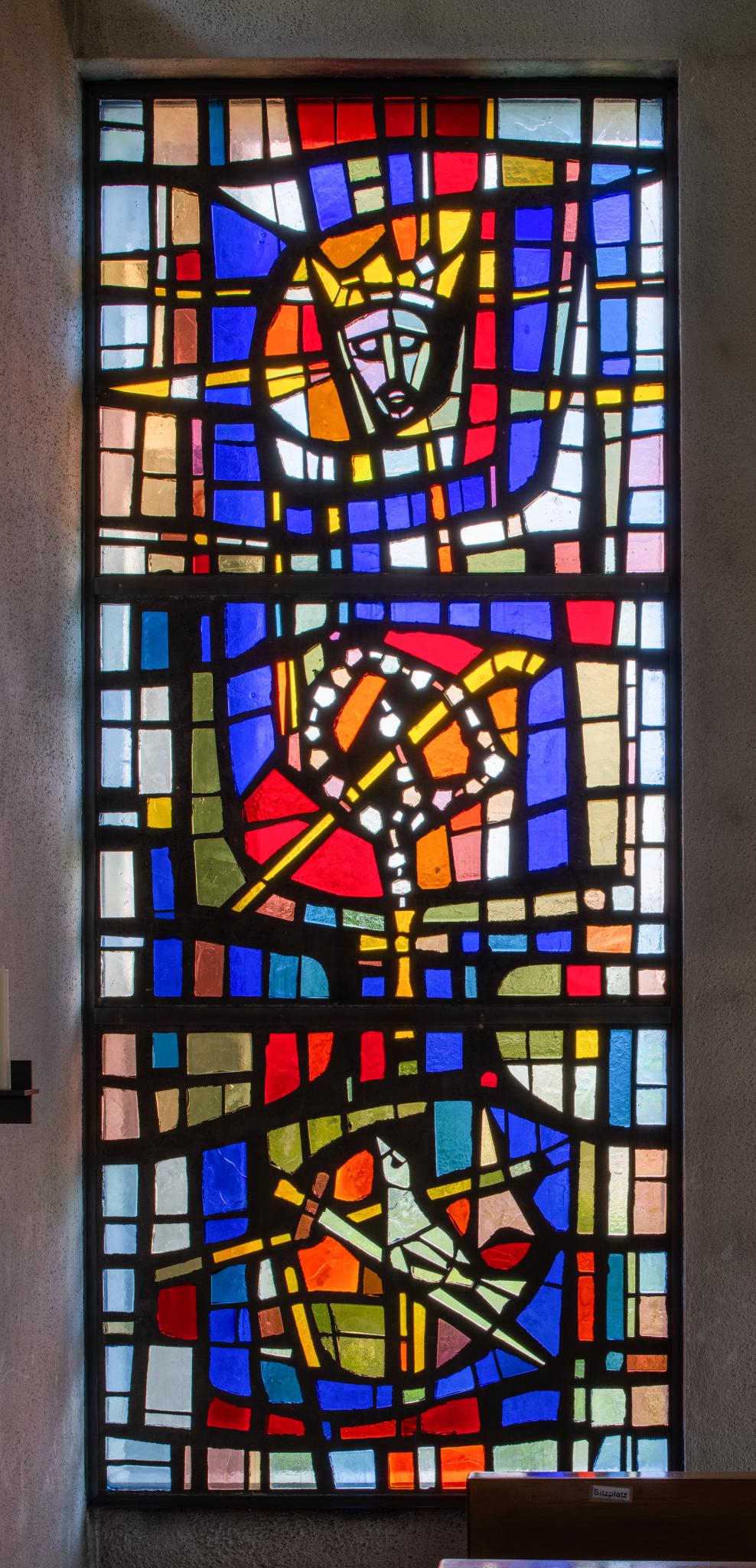 Vor einem in kleine Rechtecke aufgelösten Hintergrund sind drei Symbole dargestellt: Zuoberst das gekrönte Haupt Christi, in der Mitte die Attribute von Bruder Klaus, Pilgerstab und Rosenkranz, zuunterst zwei gekreuzte Waffen, Beil und Schwert, auf denen die Friedenstaube sitzt. Letzteres steht für die durch Bruder Klaus’ Ratschlag herbeigeführte Versöhnung der eidgenössischen Orte an der Tagsatzung von Stans 1481.