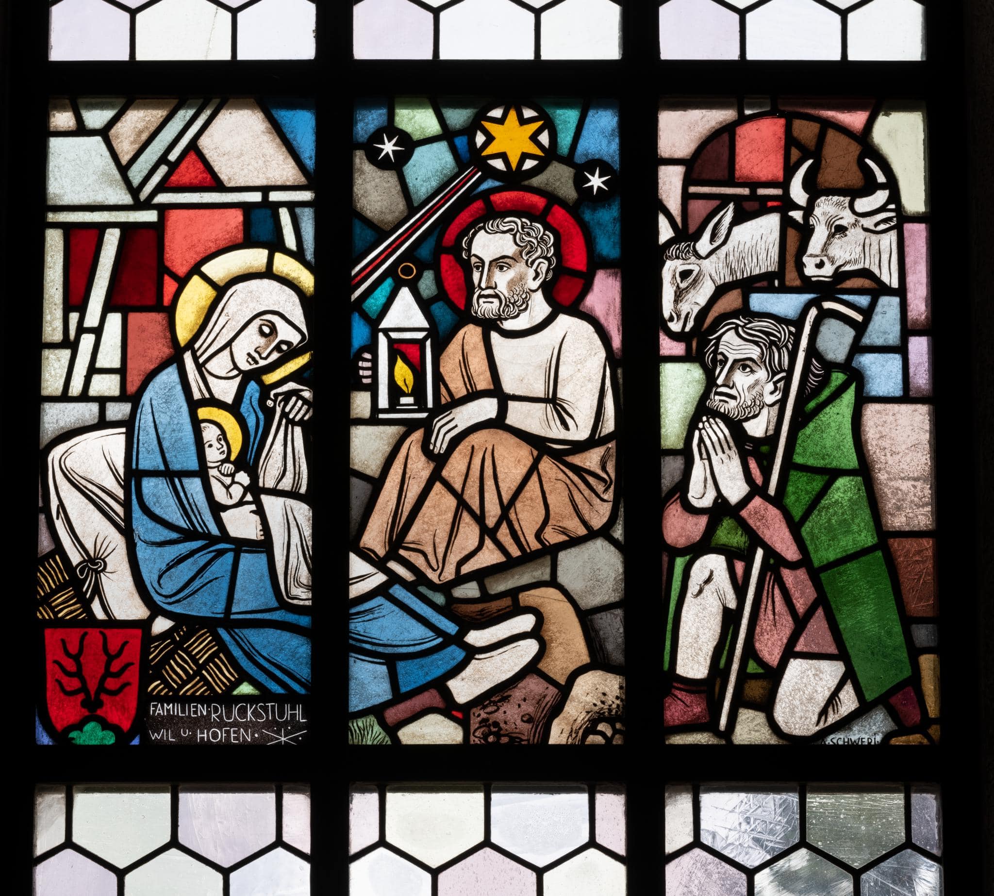 Die sitzende Maria hält das neugeborene Christuskind auf dem Schoss, neben ihr sitzt Josef mit der Laterne. Rechts kniet ein Hirte, hinter ihm schauen Ochs und Esel hinein. Am Himmel steht der Stern von Bethlehem.