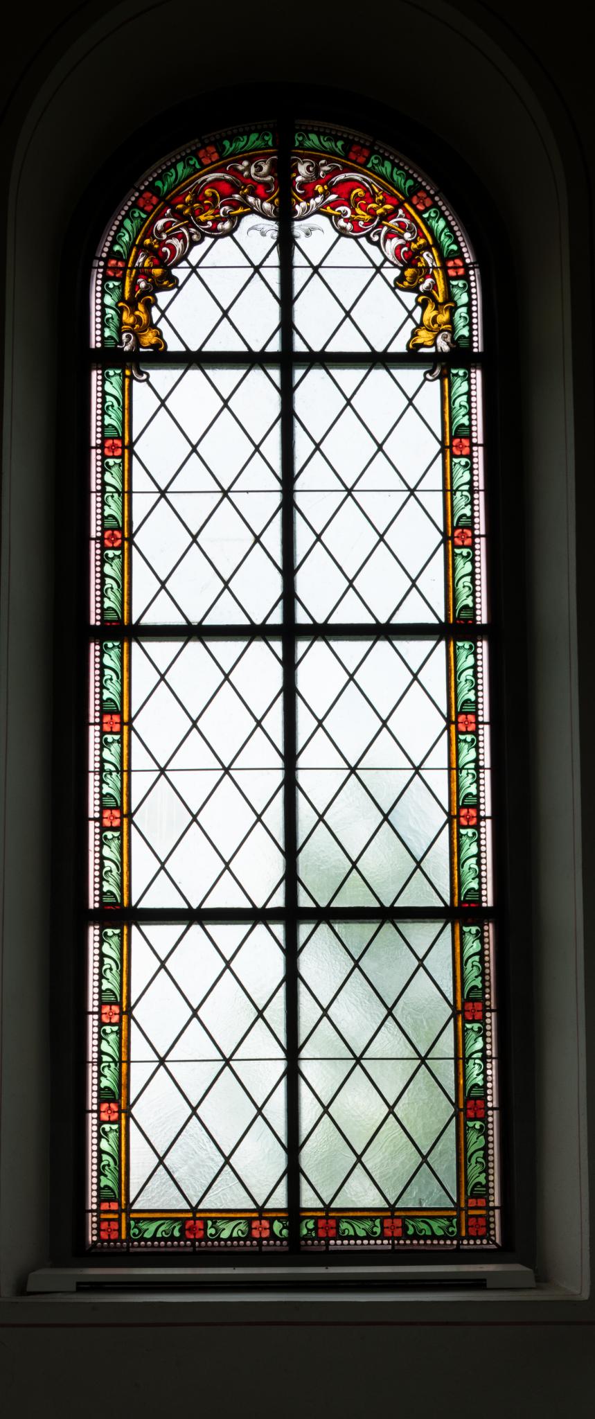 Rundbogenfenster mit blanker Rautenverglasung und farbiger Randverzierung mit Blättern und Blüten. Im Bogenfeld zudem ein schmückender Blattkranz.