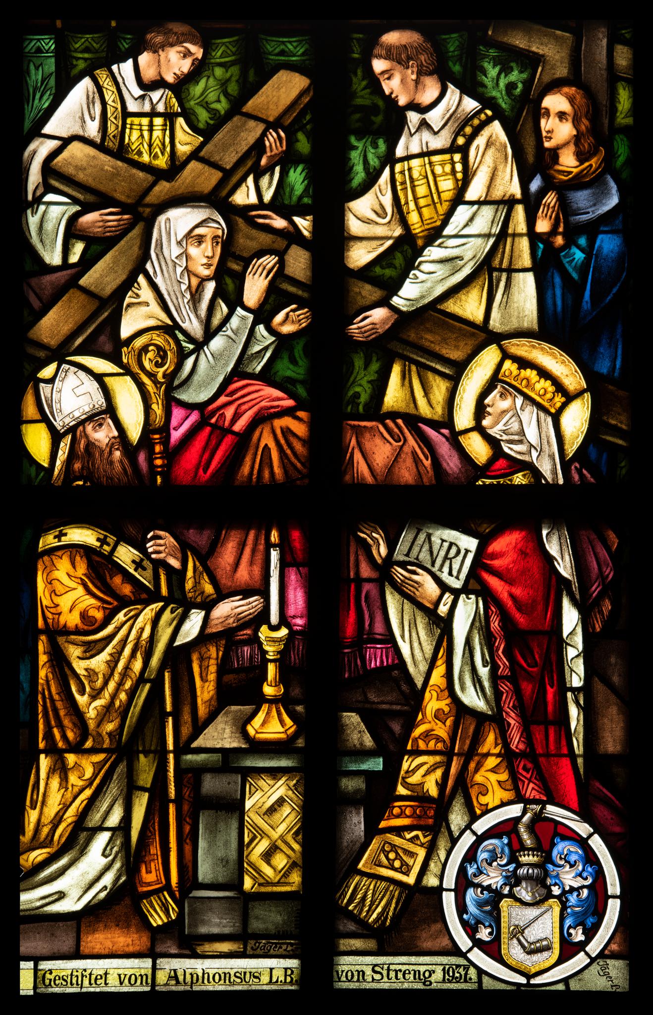 Dargestellt ist die Auffindung des heiligen Kreuzes. Im Vordergrund stehen rechts die heilige Helena und links der Bischof Makarios I. von Jerusalem. Sie wenden sich einer auf dem Totenbett liegenden Frau zu, die durch Berührung des wiedergefunden Kreuzes erweckt wurde.