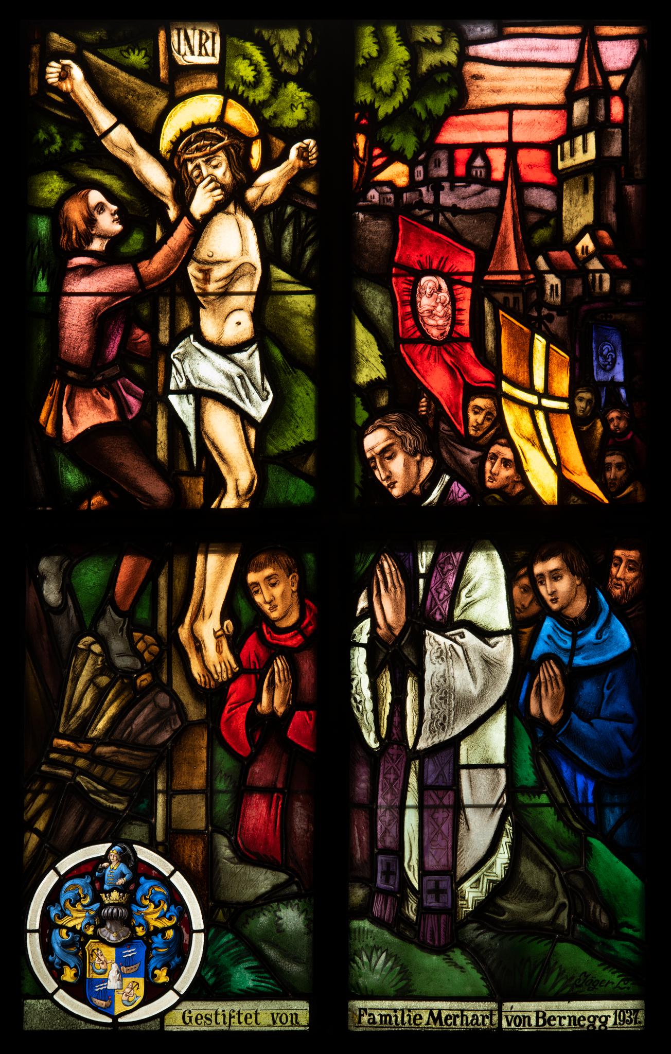 Die Glasmalerei zeigt die Legende von Bernrain. Nach der Chronik von Gebhard Dacher soll im Jahr 1384 ein Konstanzer Knabe ein altes Kruzifix spottend an der Nase gefasst haben und nicht mehr davon losgekommen sein. Die 1388 vom Konstanzer Leinenweber Johann Kräntzli gegründete Heiligkreuzkapelle wurde aufgrund dieser Legende ein vielbesuchter Wallfahrtsort. Links ist der an der Nase des Gekreuzigten hängende Knabe zu sehen, rechts ein kniender Geistlicher sowie die Wallfahrt zum Kreuz.