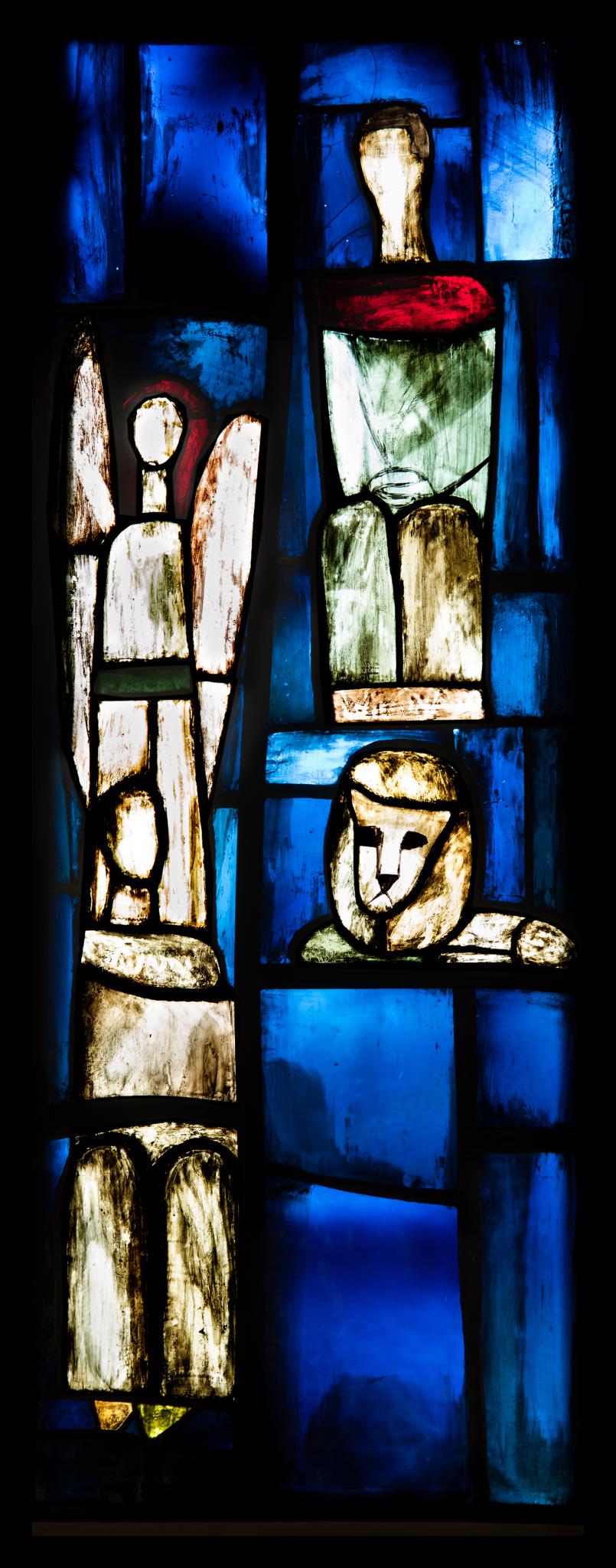 Hochrechteckiges Fenster mit den sitzenden hellen Figuren zweier Evangelisten und ihrer Symbole vor dunkelblauem Hintergrund. Links unten Matthäus mit dem hinter ihm stehenden Engel, rechts oben Markus mit dem Löwen zu seinen Füssen. Einzelne gelbe und rote Farbakzente.