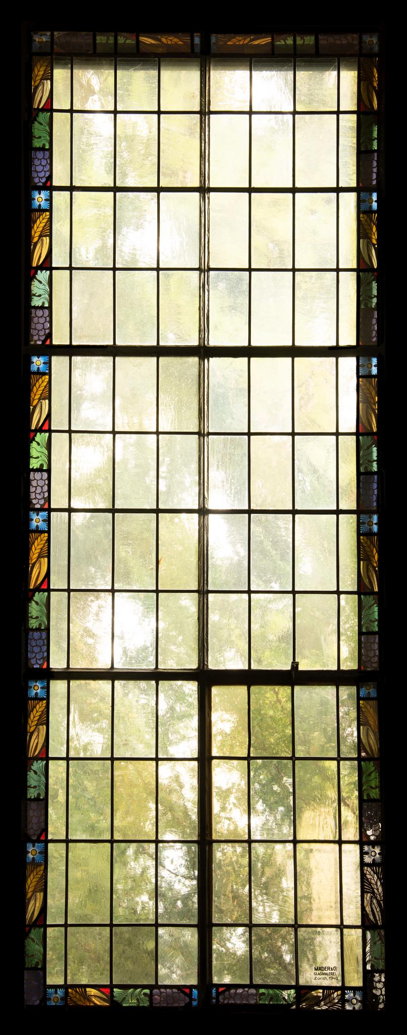 Hochrechteckige blankverglaste Fenster, gerahmt von einer schmalen Glasmalereiborte in der Art der Neogotik (Ähren, Kornblumen, Trauben, Weinblätter).