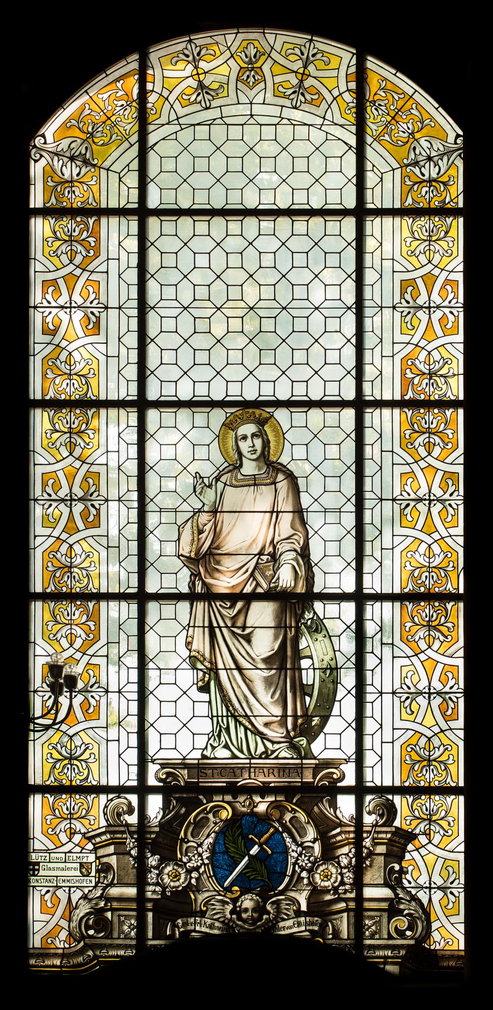 Grosses Segmentbbogenfenster mit der Darstellung der heiligen Katharina auf einem architektonisch gestalteten Sockel in Grisaille und zarten Farben (gelb und grün). Die Heilige trägt eine Krone und ist mit Rad und Buch gezeigt. Eine breiter, vegetabiler Rahmen umfasst das ansonsten blank verglaste Fenster. Im Sockel Kartusche mit Schwert und Palmzweig, an der Sockelbasis Namenszug.