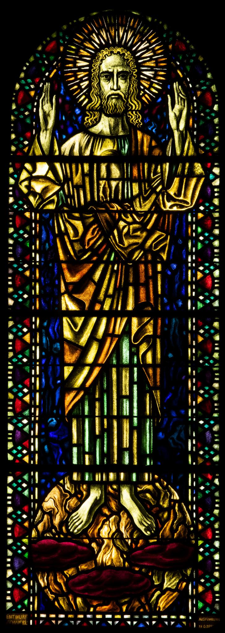 Im Rundbogenfenster steht Christus mit erhobenen Händen vor blauem Hintergrund auf der Erdkugel, die von drei roten Wolken umgeben wird. Eine farbige Bordüre rahmt die Figur.