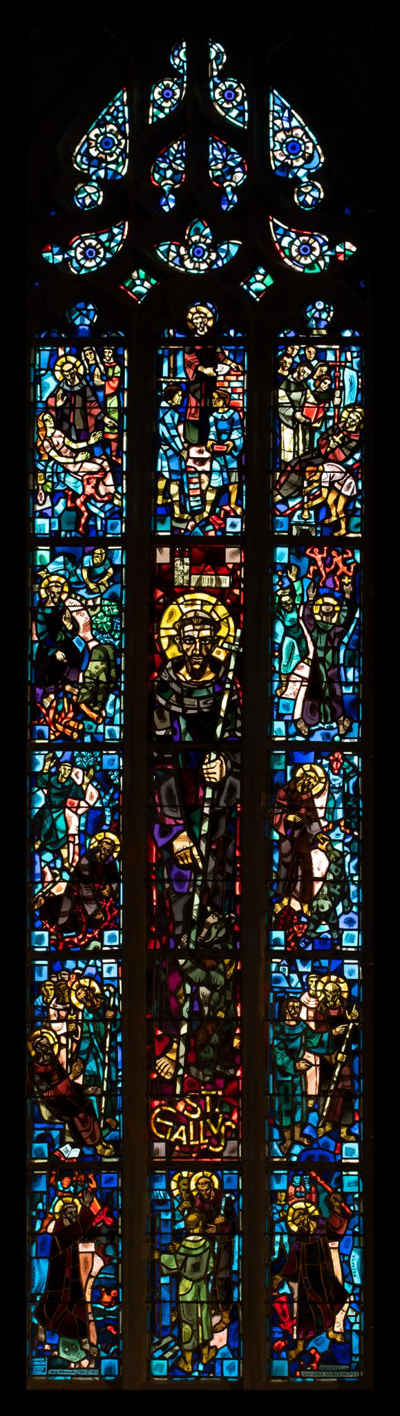 Dreilanzettiges Masswerkfenster in Blau- und Rottönen. In der Mitte steht der heilige Gallus, um ihn herum sind Szenen aus seinem Leben angeordnet