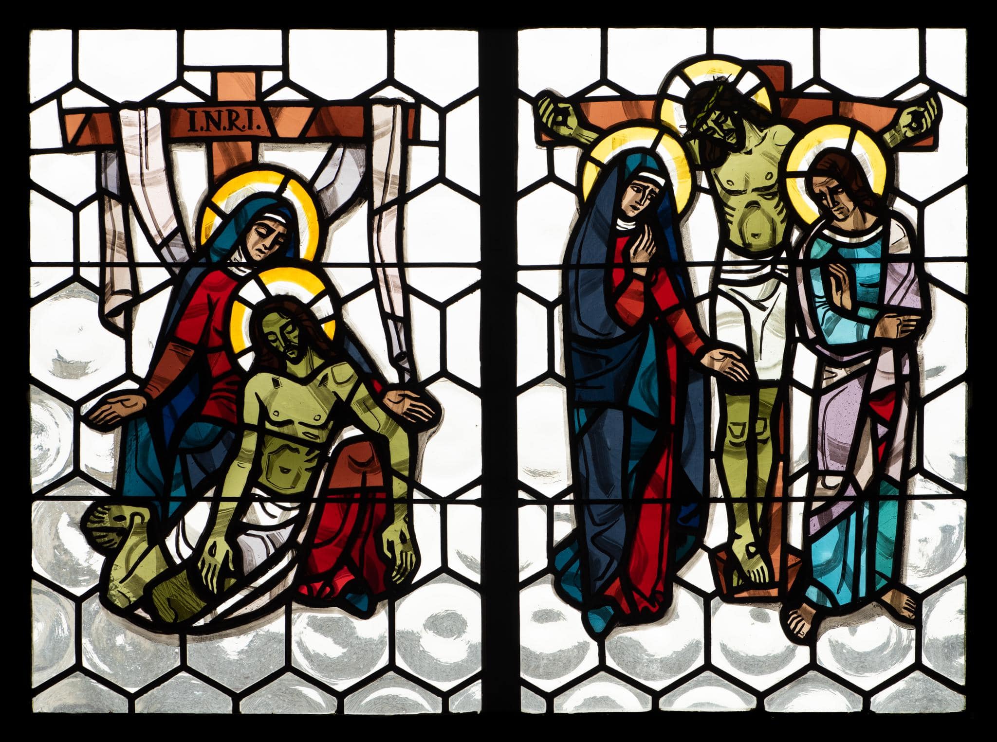 In acht Rundbogenfenster mit Bienenwaben-Blankverglasung wird ein Kreuzweg dargestellt. Im Fenster s VI ist rechts der Tod Christi am Kreuz mit Maria und Johannes zu sehen, links liegt der verstorbene Christus im Schoss seiner Mutter.