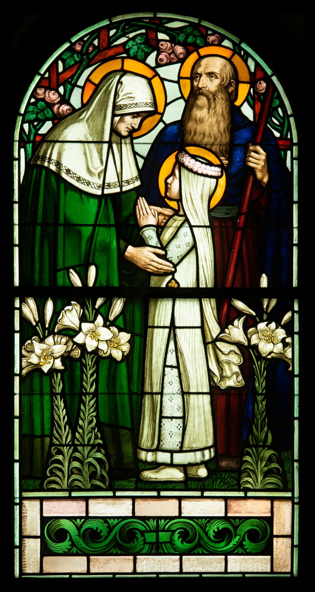 Zweiteiliges Rundbogenfenster mit der Darstellung der Maria als Kind und deren Eltern Anna und Joachim. Maria ist in weissem Kleid mit Schleier und Blumenkranz gezeigt, sie hat die Hände gefaltet und blickt zur Mutter hoch. Anna, in einem grünen Gewand und mit weissem Kopftuch, wendet sich Maria zu, neben ihr steht Joachim mit dem Hirtenstab in der linken Hand. Das Bogenfeld ist mit Rosen geschmückt, im Vordergrund verweisen drei weisse Lilien auf die dargestellten Personen. Am Scheibenfuss ein Ornamentfeld mit grünen Ranken.