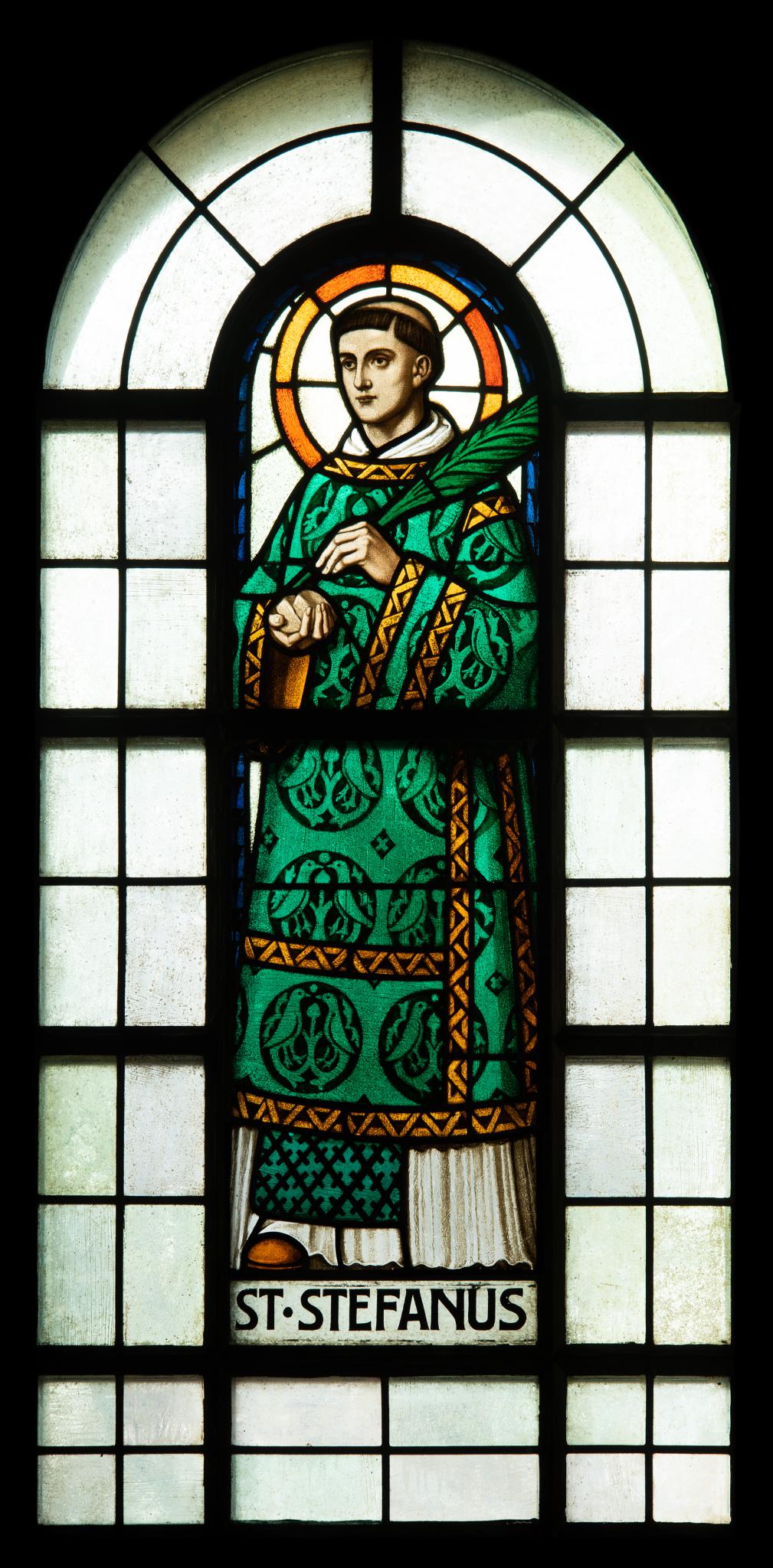 Mit opaken Rechtecken blank verglastes Rundbogenfenster mit der Darstellung der Ganzfigur des heiligen Stefanus in den beiden zentralen Feldern. Der Heilige mit Tonsur ist in einem reich geschmückten Diakonsgewand gezeigt, in der rechten Hand hält er Steine, in der linken einen Palmzweig als Hinweis auf sein Martyrium. Unterhalb der Figur Namenszug.