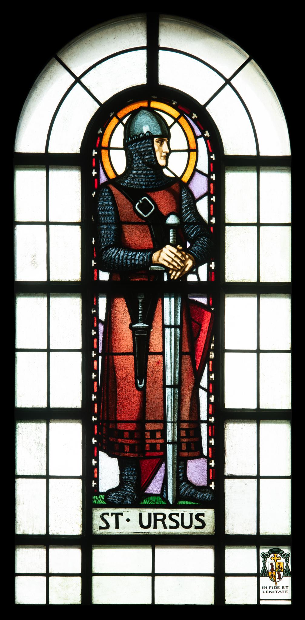 Mit opaken Rechtecken blank verglastes Rundbogenfenster mit der Darstellung der Ganzfigur des heiligen Ursus in den beiden zentralen Feldern. Der Thebäer trägt einen spitzen Helm, Kettenhemd und Waffenrock. Er hat einen Schweizerdolch umgehängt und stützt die Hände auf sein Schwert. Hinter ihm ist der rote Schild der thebäischen Legion zu erkennen. Unterhalb der Figur Namenszug.