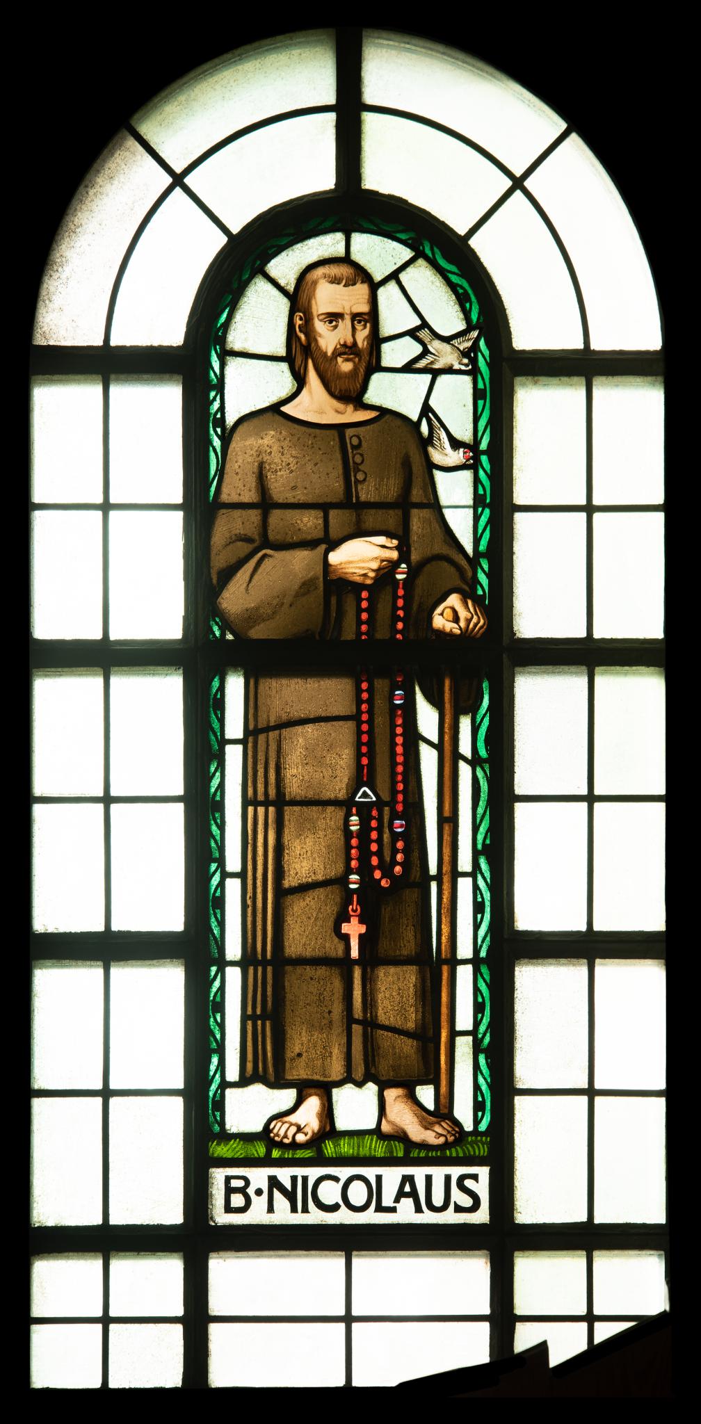 Mit opaken Rechtecken blank verglastes Rundbogenfenster mit der Darstellung der Ganzfigur des heiligen Bruder Klaus in den beiden zentralen Feldern. Der Heilige ist in der braunen Kutte des Eremiten gezeigt, in den Händen hält er einen Stab und einen Rosenkranz. Zu seiner Rechten fliegen zwei Vögel. Unterhalb der Figur Namenszug.