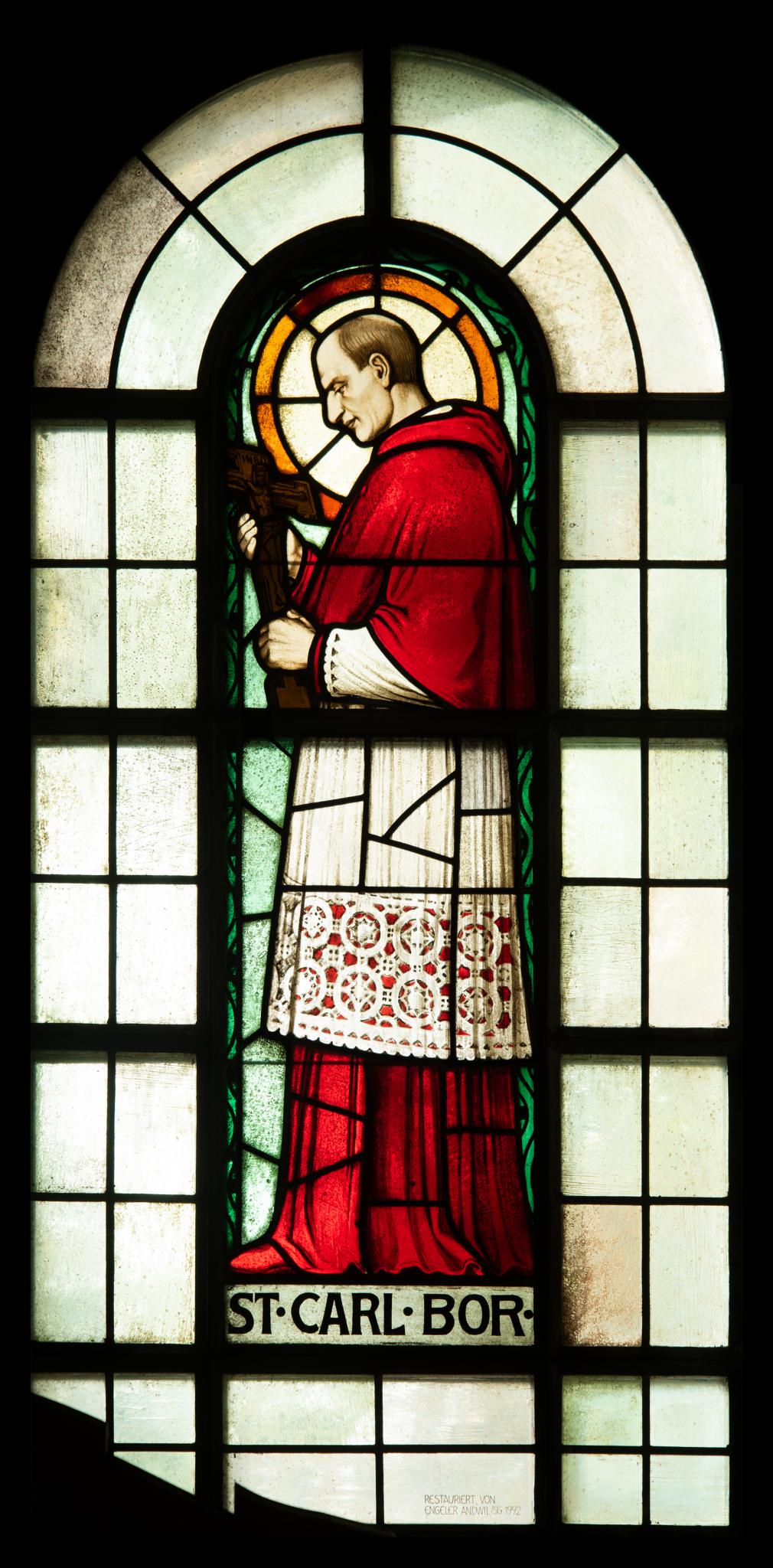 Mit opaken Rechtecken blank verglastes Rundbogenfenster mit der Darstellung der Ganzfigur des heiligen Karl Borromäus in den beiden zentralen Feldern. Der Heilige ist im Kardinalsgewand gezeigt, in den Händen hält er das Kruzifix. Unterhalb der Figur Namenszug.