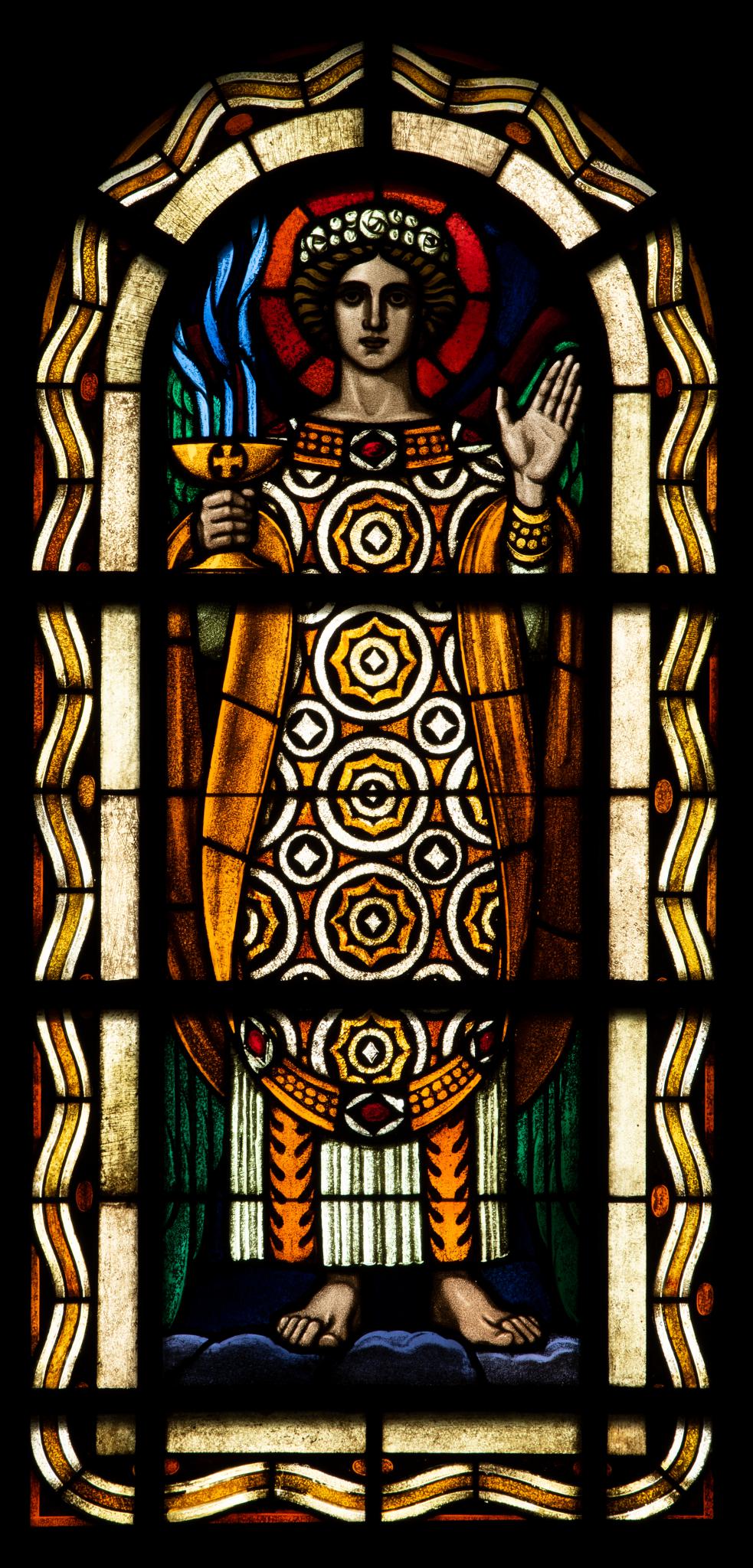 Insgesamt vier Rundbogenfenster mit je einer Darstellung eines auf einer Wolke stehenden Engels mit grünen Flügeln. Die Engel tragen reich ornamentierte Gewänder und einen Blumenkranz im Haar. Ihre eine Hand ist erhoben, in der anderen halten sie einen Kelch mit blauen Flammen. Ornamentrahmen mit einem Bandmuster umfassen die bildliche Darstellung.