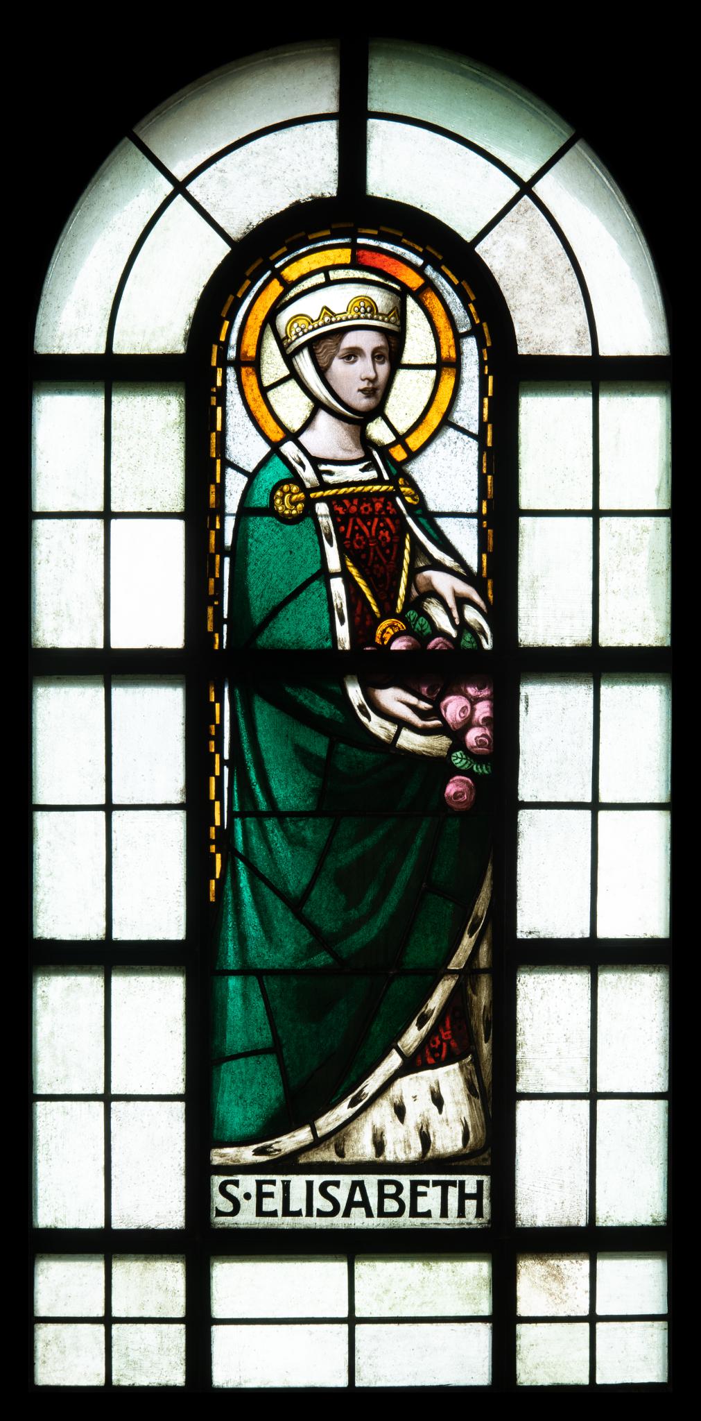 Mit opaken Rechtecken blank verglastes Rundbogenfenster mit der Darstellung der Ganzfigur der heiligen Elisabeth von Thüringen in den beiden zentralen Feldern. Die Königstochter ist in hermelinbesetzten Gewändern gezeigt, im Umhang trägt sie Rosen, die auf das häufig dargestellte Rosenwunder verweisen. Unterhalb der Figur Namenszug.