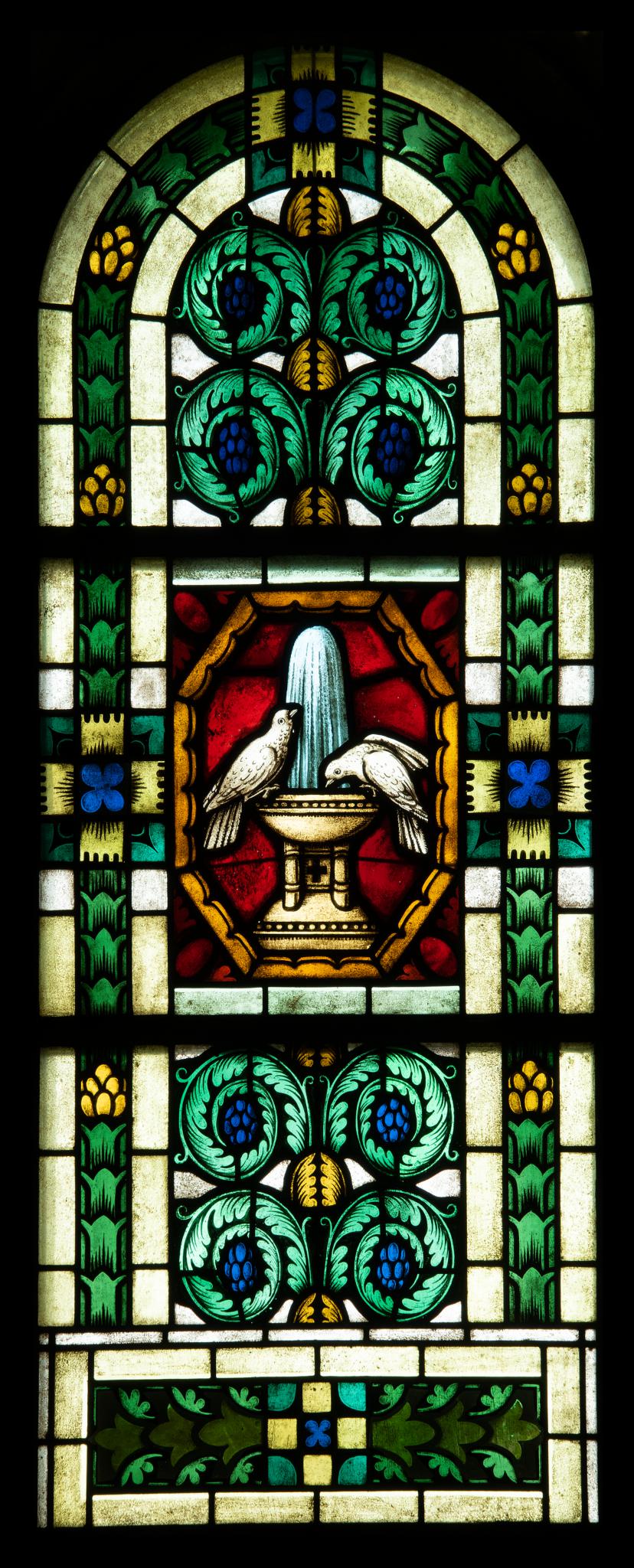 Dreiteiliges Rundbogenfenster mit zentralem Medaillon, in dem zwei Tauben gezeigt sind, die aus einem Taufbecken trinken. Übrige Fensterfläche mit stilisierten Blatt- und Blumenornamenten in Grün, Blau, Gelb und Weiss geschmückt.
