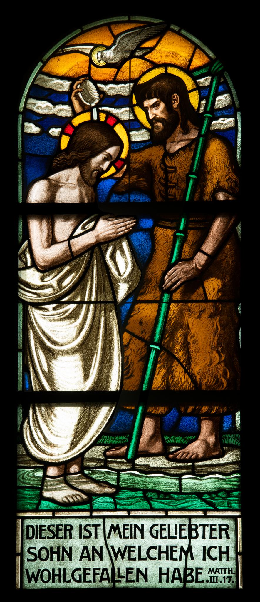 Dreiteiliges Rundbogenfenster mit der Darstellung der Taufe Christi im Jordan. Christus ist mit gefalteten Händen im Wasser stehend gezeigt. Johannes – in Fellgewand und mit Schilfkreuz – giesst aus einer Muschel Wasser über das Haupt Christi. Im Bogenfeld die Darstellung des Heiligen Geistes als Taube, im Hintergrund drei Wolkenbänder. Am Scheibenfuss Kartusche mit Inschrift.