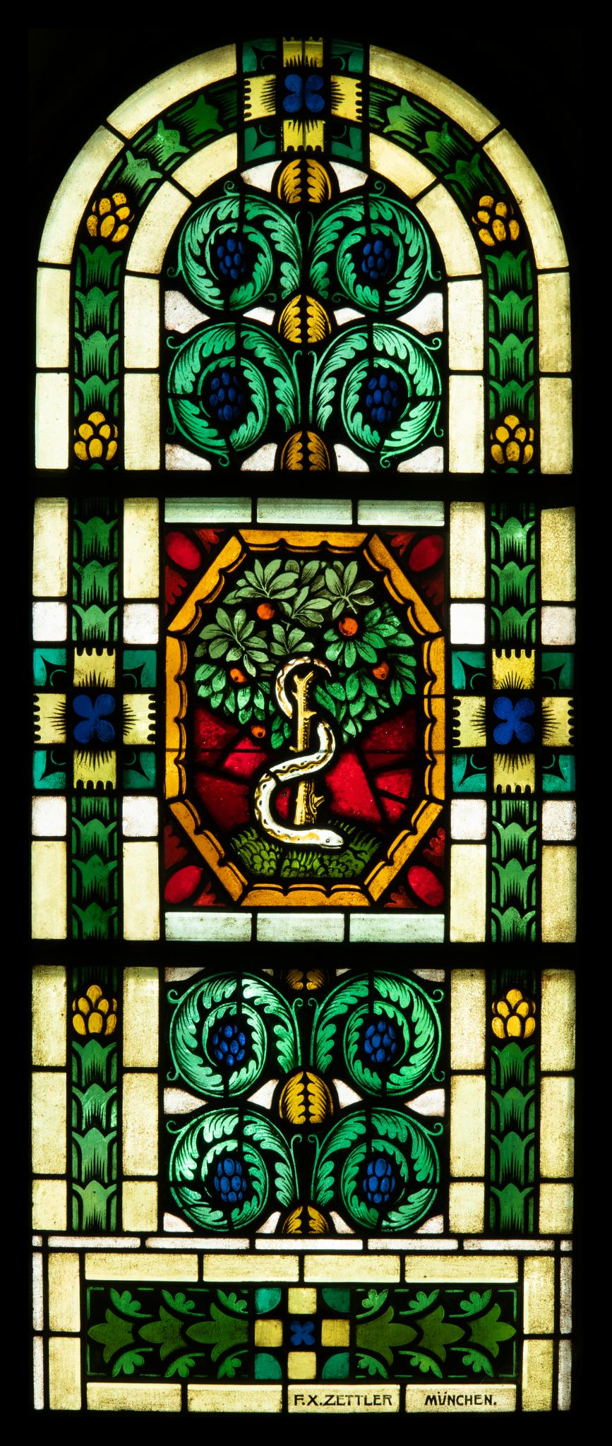 Dreiteiliges Rundbogenfenster mit zentralem Medaillon, in dem sich die Schlange als Sinnbild der Erbsünde um den Baum der Erkenntnis schlingt. Übrige Fensterfläche mit stilisierten Blatt- und Blumenornamenten in Grün, Blau, Gelb und Weiss geschmückt.
