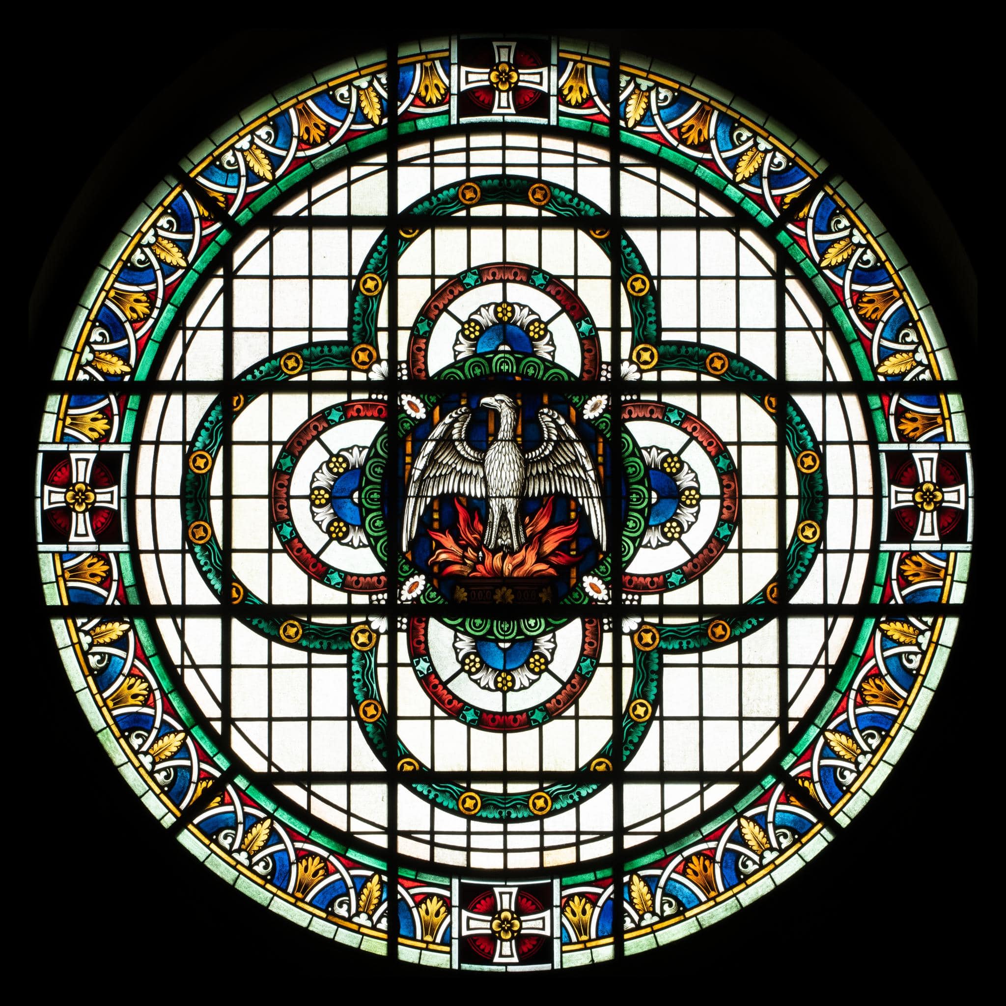 Mit opaken Rechtecken blank verglastes Rundfenster mit Rahmenverzierung, dem zwei konzentrische Vierpässe einbeschrieben sind. Im Zentrum des inneren Vierpasses ist mit ausgebreiteten Flügeln der mythologische Vogel Phoenix gezeigt, der aus den Flammen steigt. Das Netz aus Quereisen betont die Kreuzform.